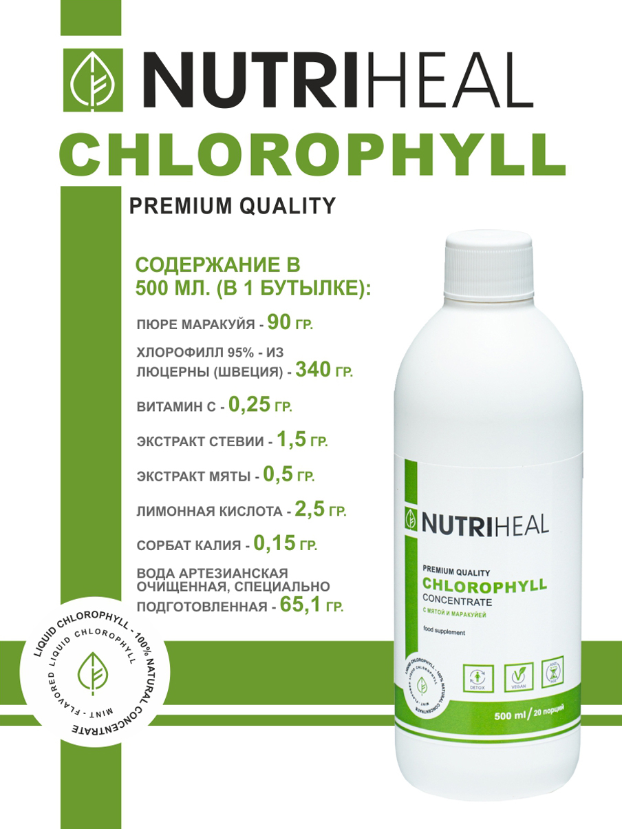 Состав:Хлорофилл 95% из люцерны (Швеция), витамин С, лимонная кислота, пюре маракуйя, сорбат калия, специально подготовленная вода артезианская очищенная, экстракт мяты, экстракт стевииСпособ применения:1 столовая ложка (20 мл) 2 раза в день перед едой. М