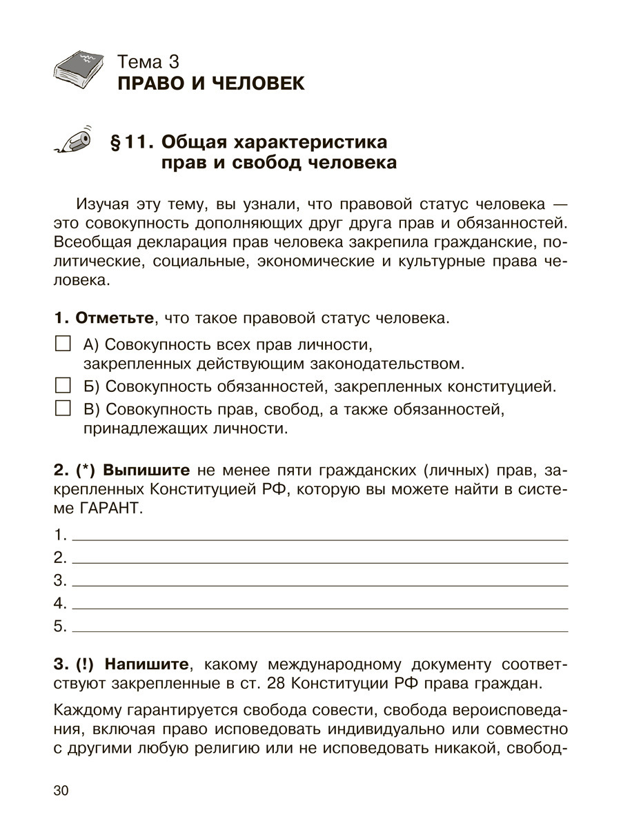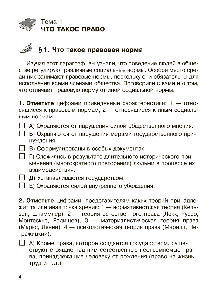 Рабочая тетрадь предназначена для проверки знаний учащихся по курсу права, а так же для формирования навыков самостоятельной работы с различными видами документов и выполнения практических заданий, в том числе при работе с электронным приложением к учебни