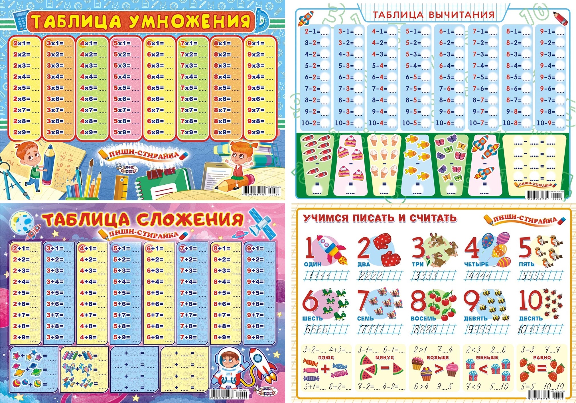 Набор из четырех разных плакатов.Состав набора: Учимся писать и считать, Таблича вычитания Таблица умножения, Таблица сложенияПлакаты можно повесить на стену или положить на стол, за которым ребёнок учится и играет, чтобы они всегда были перед глазами. Ка
