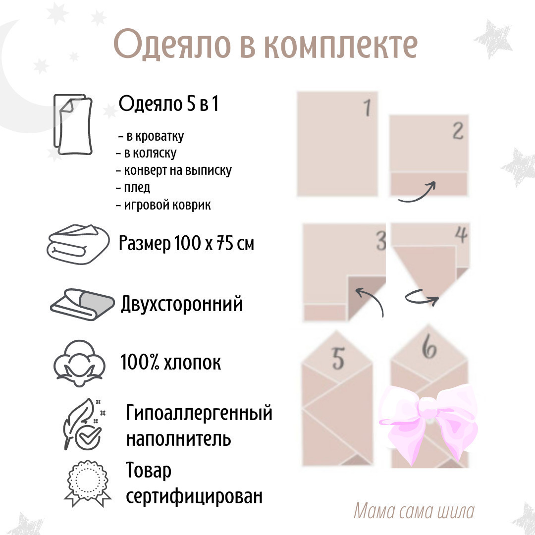 Детское одеяло для новорожденных подойдёт для кроватки любой формы, для люльки или прогулок в коляске. Малышу будет удобно спать, он не будет перегреваться и потеть - одеяло сшито из натурального 100% хлопка и гипоаллергенного наполнителя. Можно использов