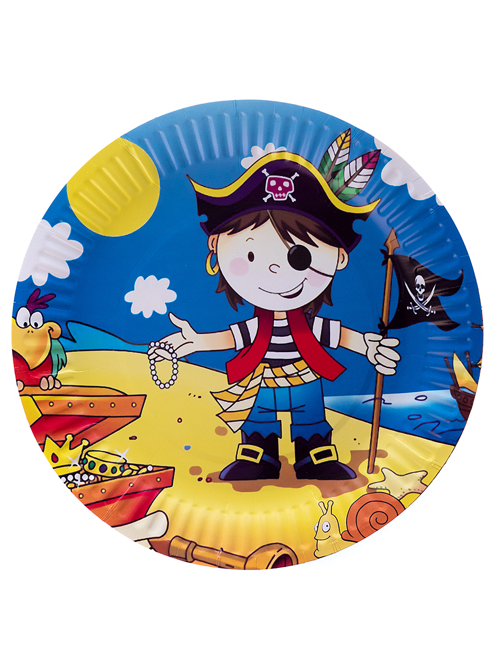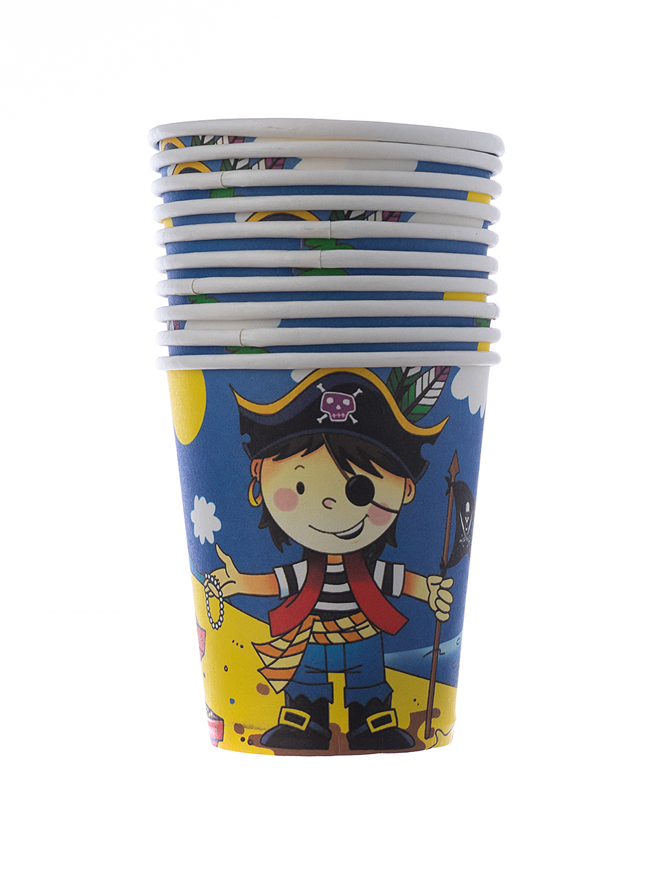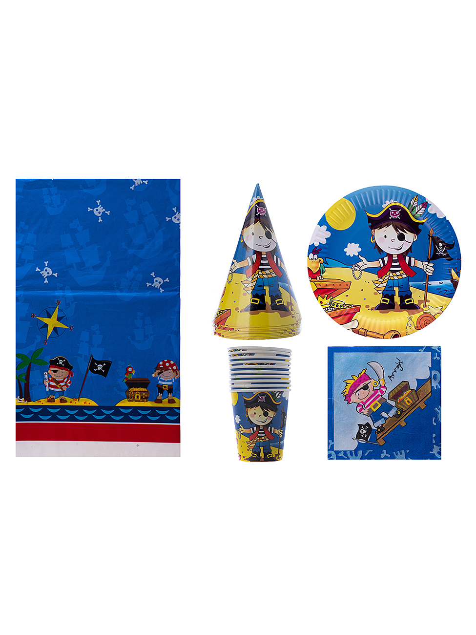 Одноразовая посуда набор "Остров Сокровищ". В набор для праздника входят: одноразовые тарелки 10 шт, одноразовые стаканы 10 шт, шапочки одноразовые 10 шт, скатерть одноразовая 1 шт. Одноразовые стаканы и одноразовые тарелки выполнены из специальной плотно