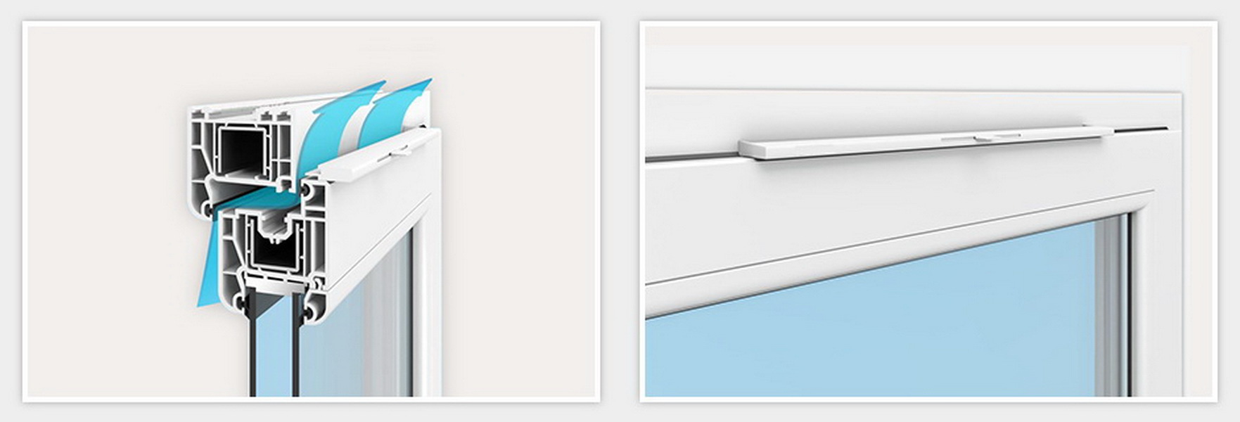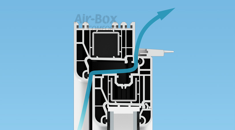 Принцип работы оконного приточного клапана Air-Box ComfortСвежий воздух с улицы попадает в канал между рамой и створкой в месте замены фрагмента типового уплотнителя на специальный.Затем через приточный клапан, установленный на верхней части створки, возд