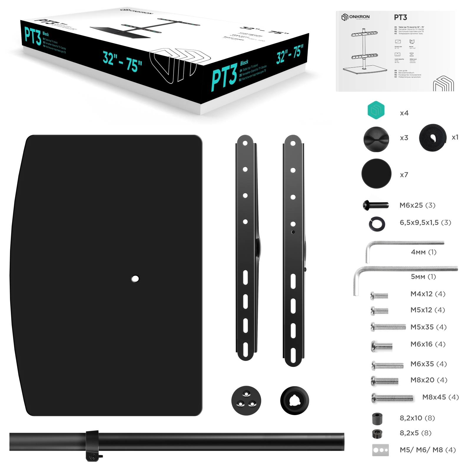 Комплектация:Стойка для телевизора, комплект ключей и крепежа для установки ТВ, фирменные силиконовые накладки, пластиковый ограничитель проворота, подробная инструкция на русском языке