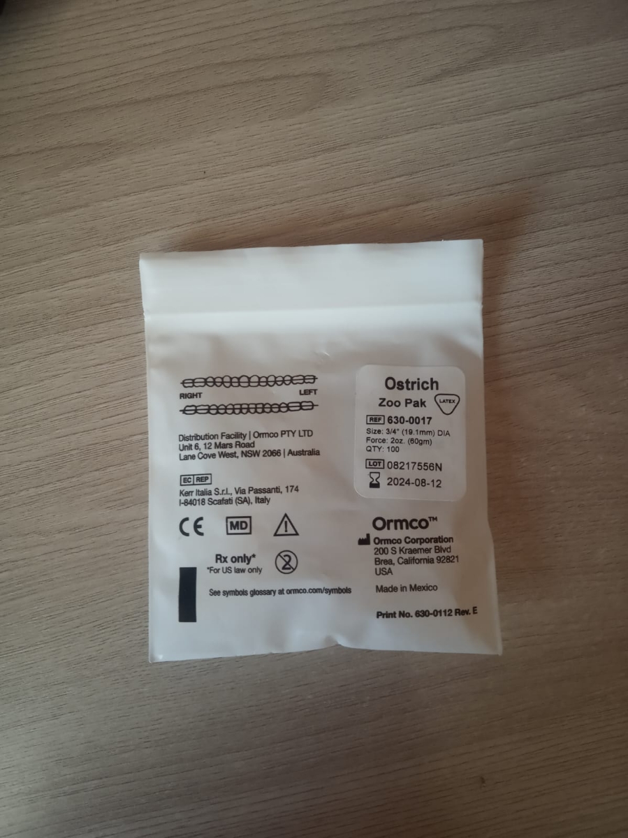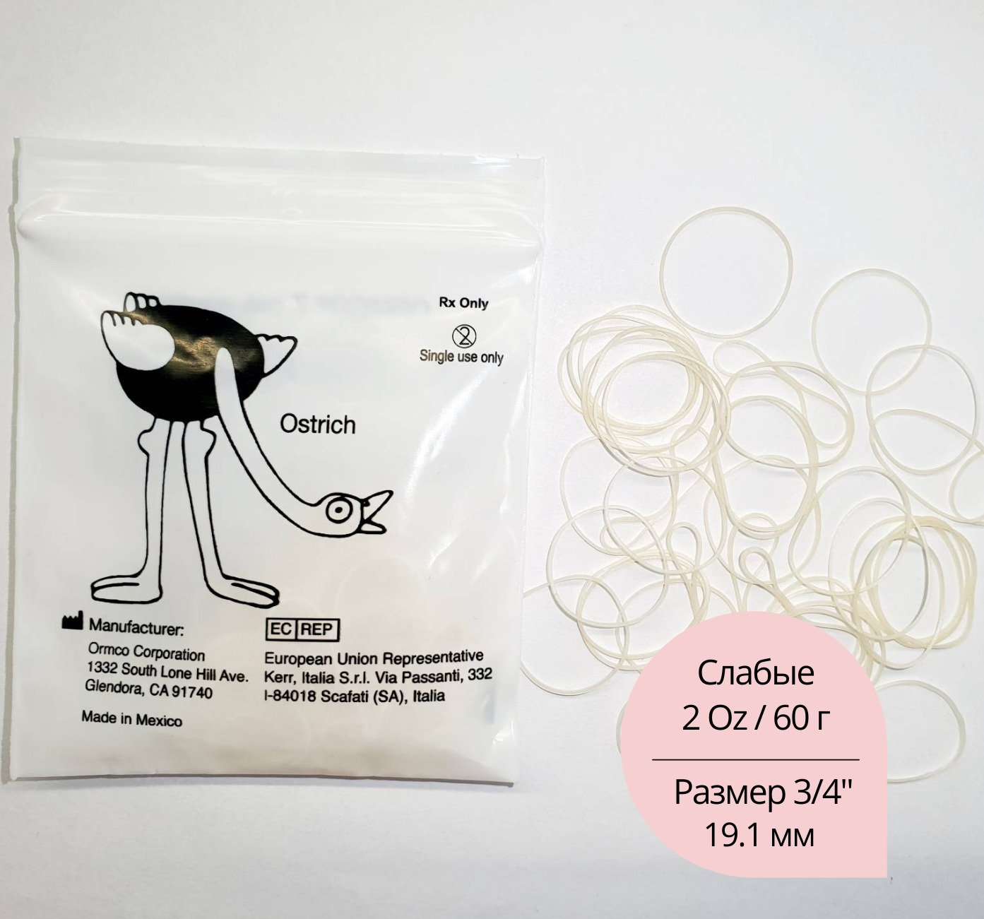 Ортодонтические эластики для брекетов фирмы Ormco из серии Zoo ("Зоопарк") - Страус / OstrichДанный товар является оригинальной продукцией компании Ormco (США).Слабые по силе - 2 Oz / 60 г., диаметр кольца 19.1 мм (3/4)Заявленное усиление эластическое кол