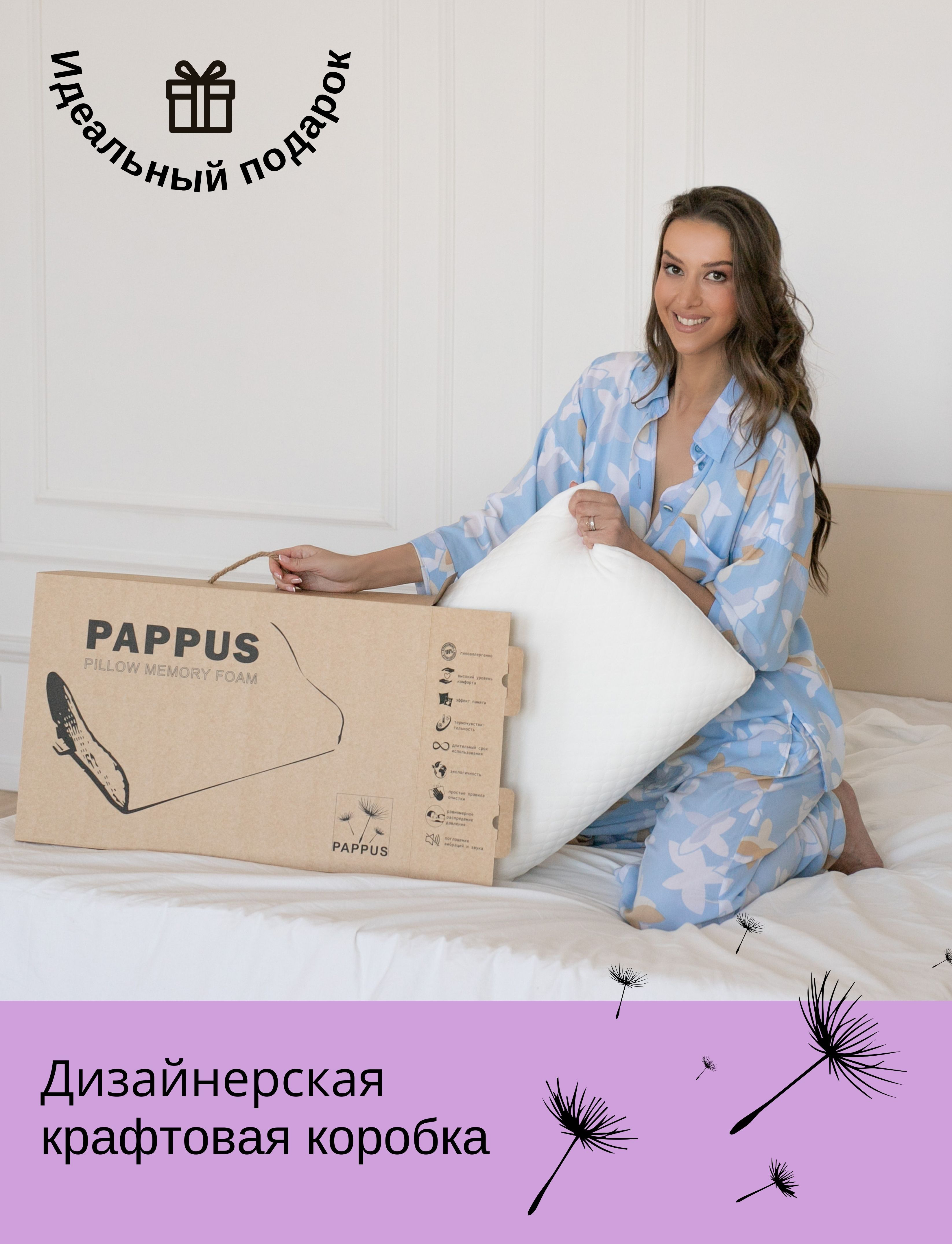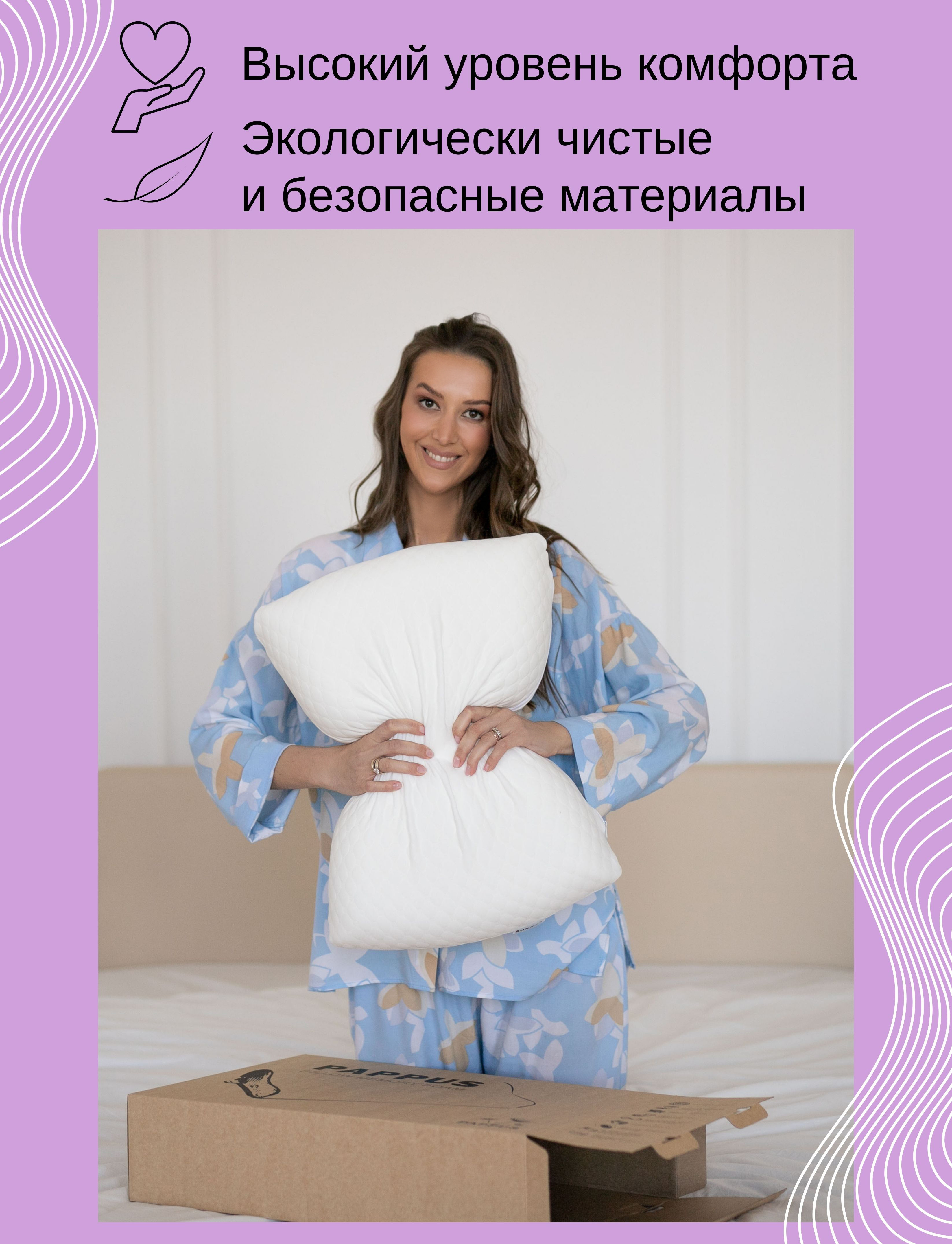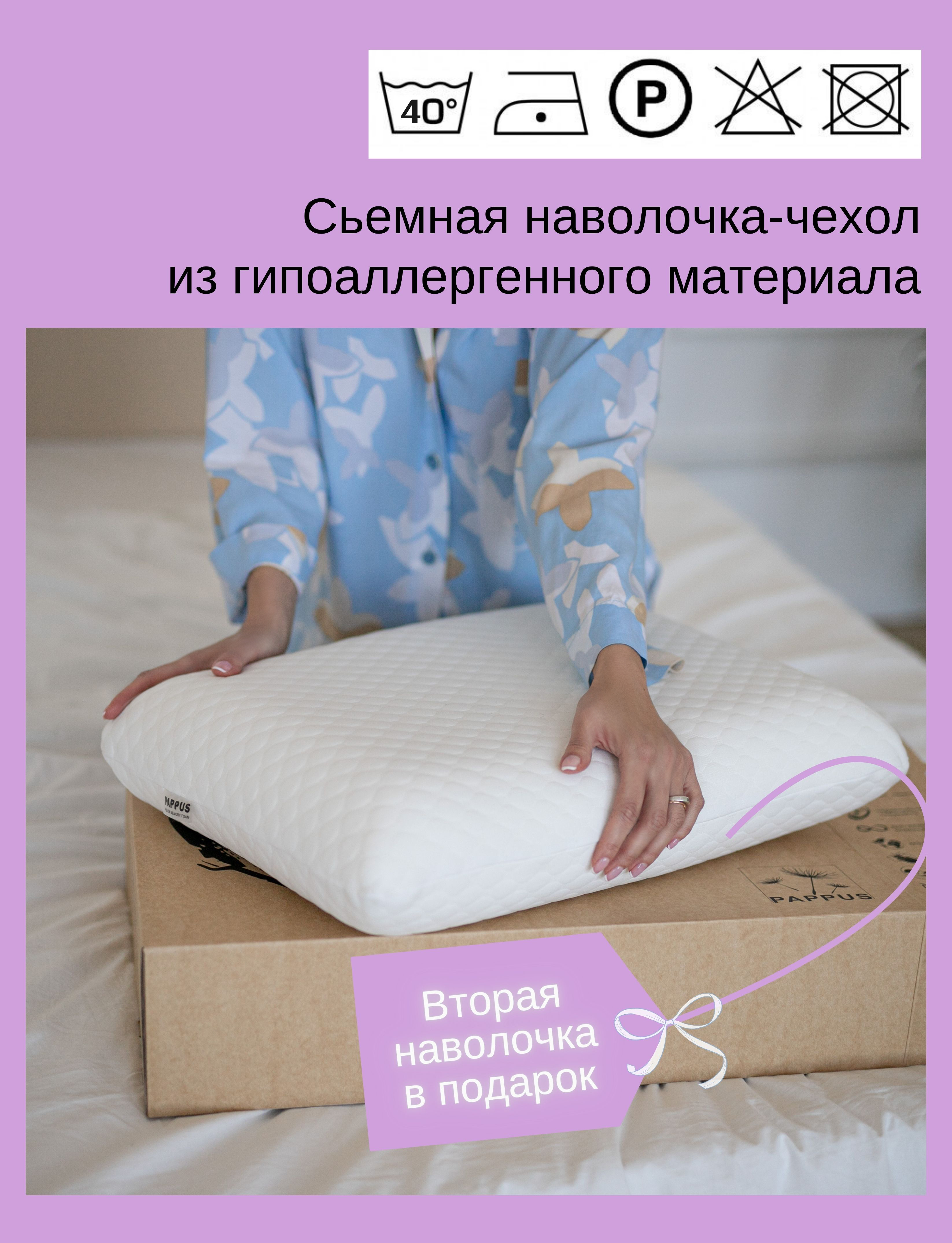 Комплектация:Подушка в трикотажном съёмном гипоаллергенном чехле-наволочке (упаковано в полиэтилен), аннотация, дополнительная наволочка-чехол, дизайнерская коробка