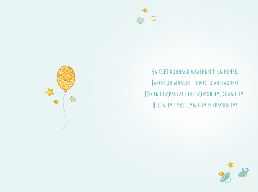 Комплектация:Открытка+конвертОписание:Изящная открытка в индивидуальной упаковке с поздравлениями с рождением мальчика! Открытка оформлена в пастельных тонах с отделкой цветными блестками в лаке и декорирована патчем в виде зайчика!