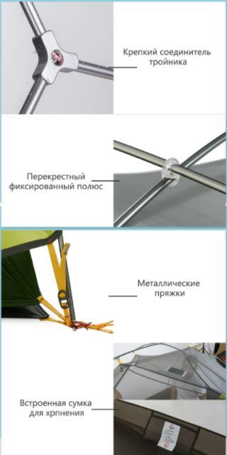 Особенности палатокБыстрая сборка, Вентиляционные окна, Тамбур, Противомоскитная сетка, Штормовые оттяжки, Внутренняя палатка, Герметизация швов
