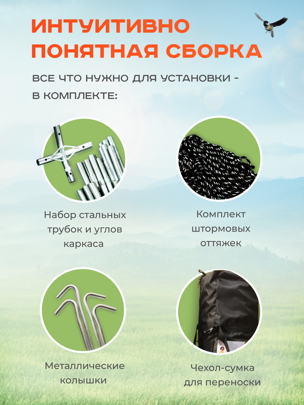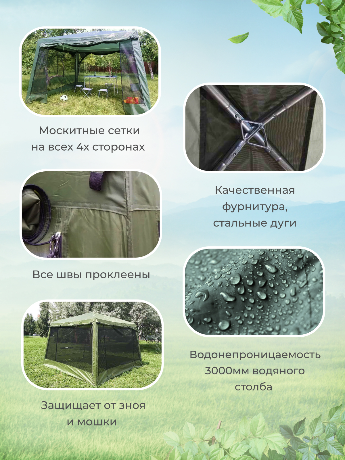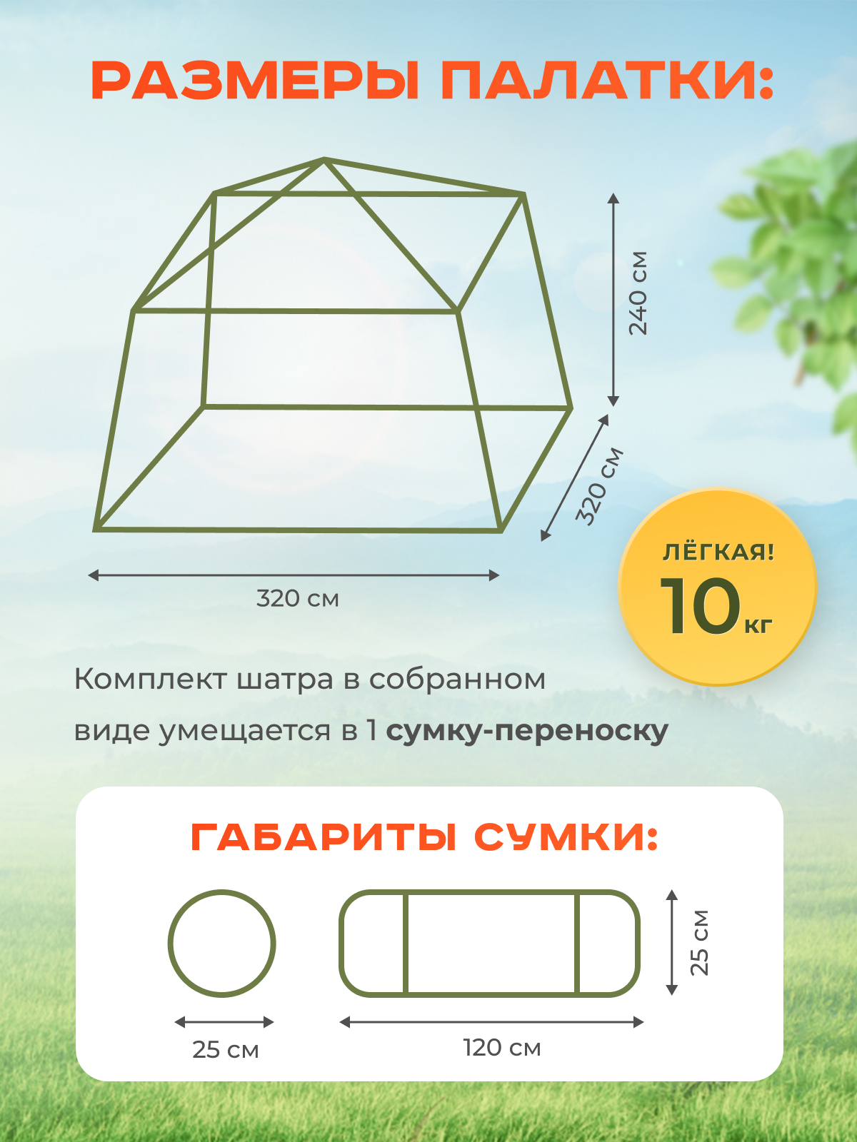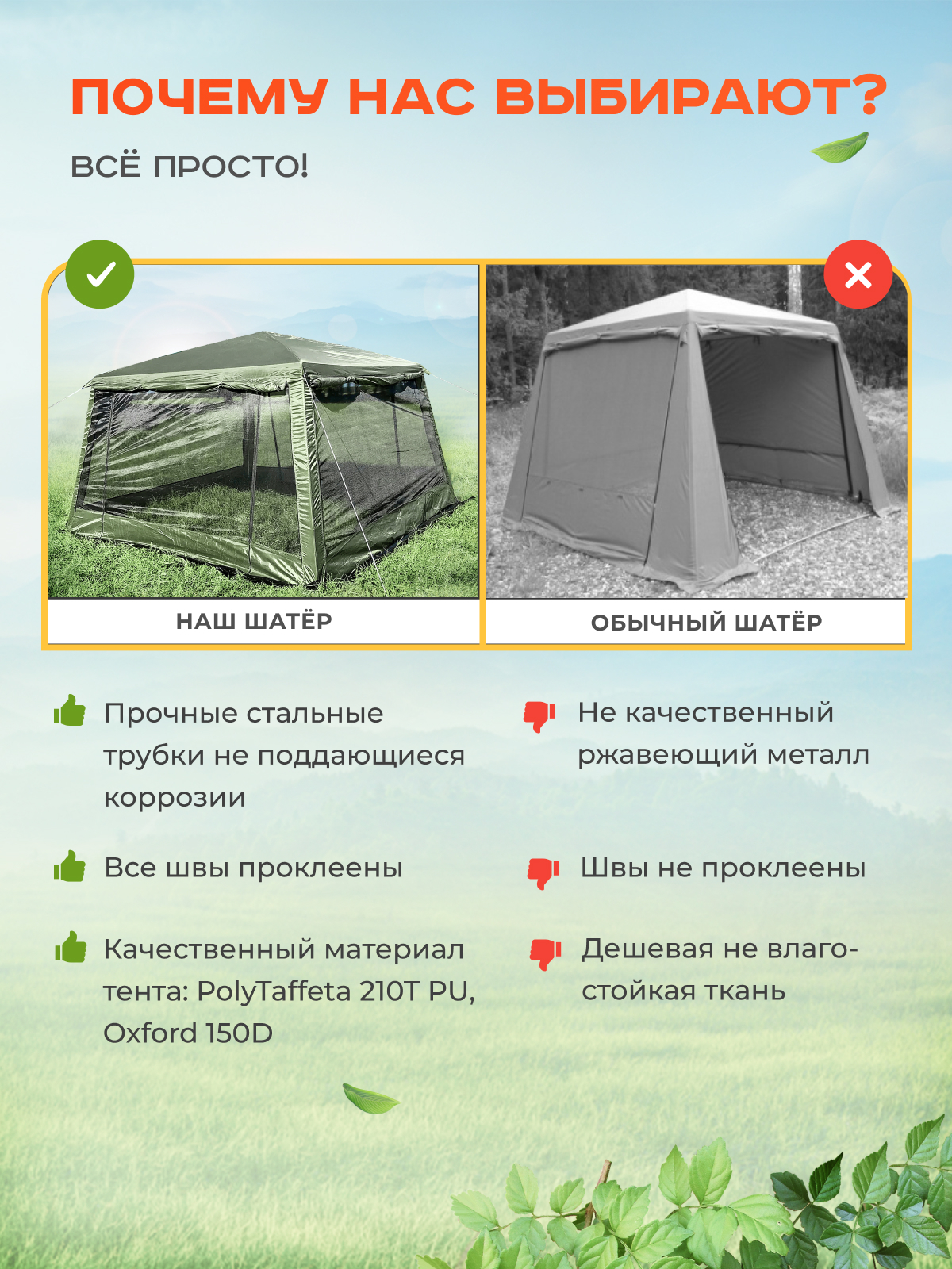Давно искали палатку для походной кухни или беседку для приятного отдыха на природе в большой компании? Вы ее нашли! Летний шатер палатка с круговым обзором - это модель туристической палатки с усиленным каркасом, и дополнительными армированными косынками