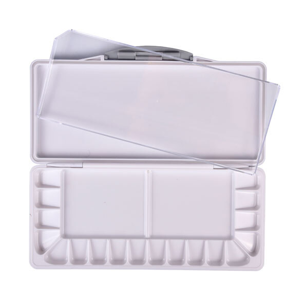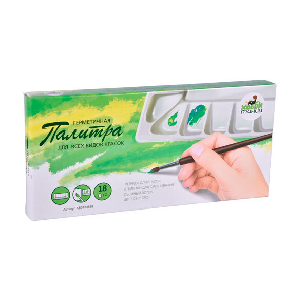 Практичная, стильная палитра-пенал из пластика прямоугольной формы в серебряном корпусе подойдет для любых видов живописи. Силиконовый кант по периметру крышки надежно защитит от протекания красок. Имеет 18 ячеек по периметру и 2 палетки для смешивания в