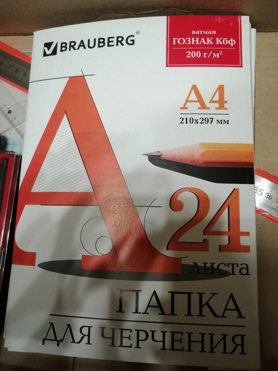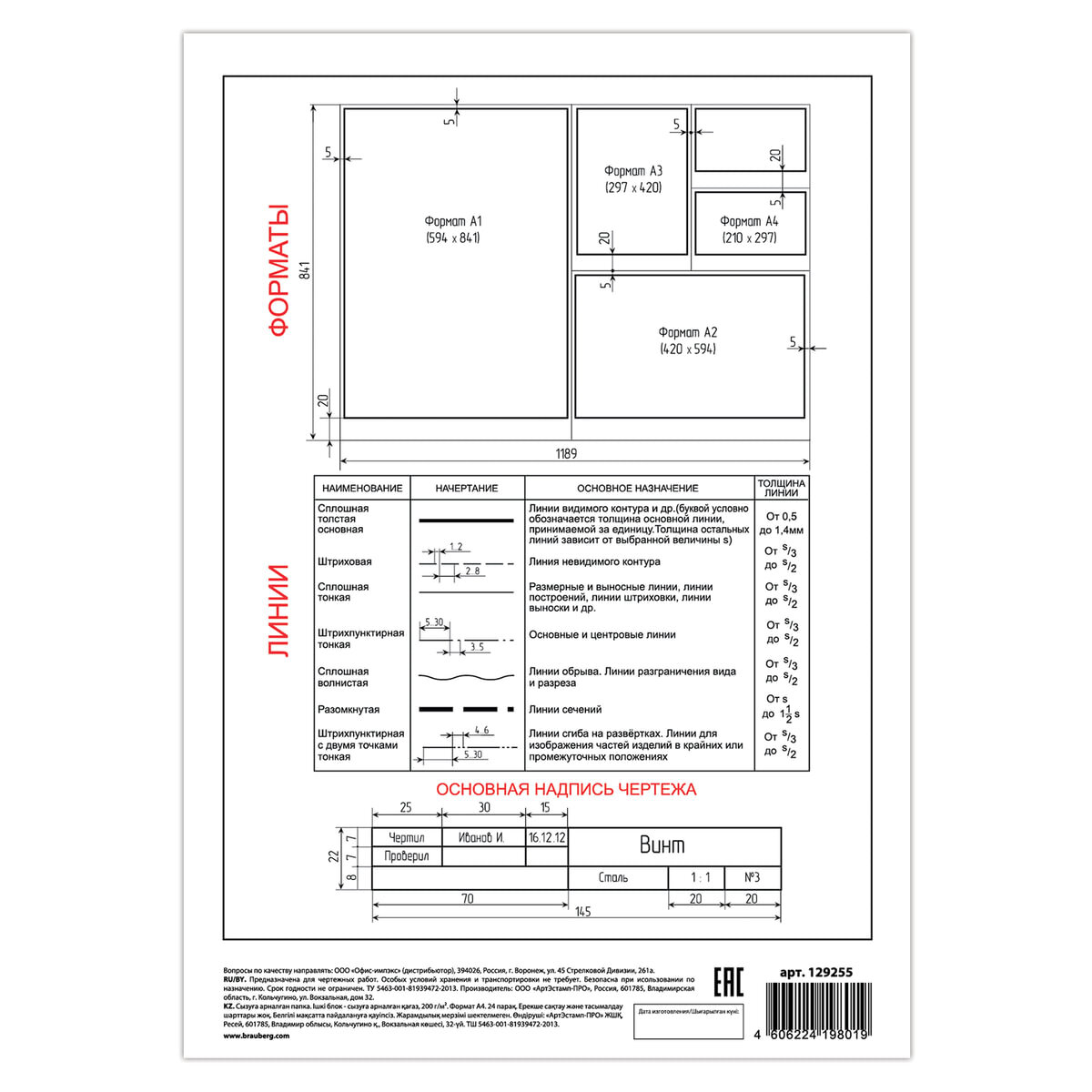 Бумага для черчения BRAUBERG содержит набор листов ватмана для выполнения чертежно-графических работ карандашами, тушью и чернилами.Внутренний блок содержит 24 листа производства ГОЗНАК КБФ плотностью 200 г/м2. Обложка выполнена из импортного мелованного