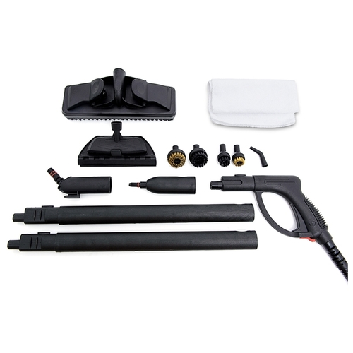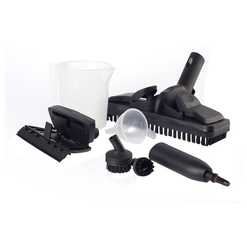 Дополнительная информацияв комплекте: удлинительная трубка, переходник к щетке для пола, тряпка для пола, угловая насадка, вспомогательная насадка, круглая нейлоновая щетка маленькая, круглая нейлоновая щетка большая, мерная чашка, воронка, сигнализация отсутствия воды