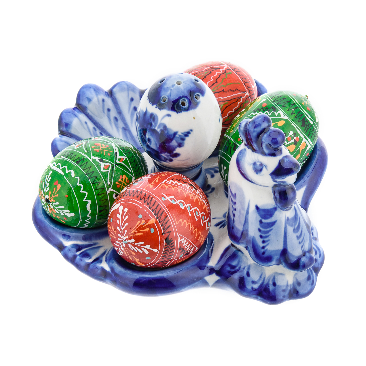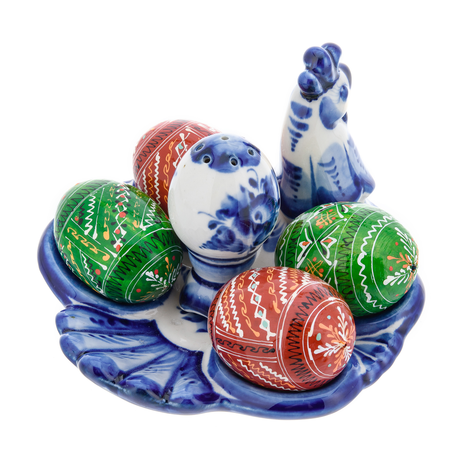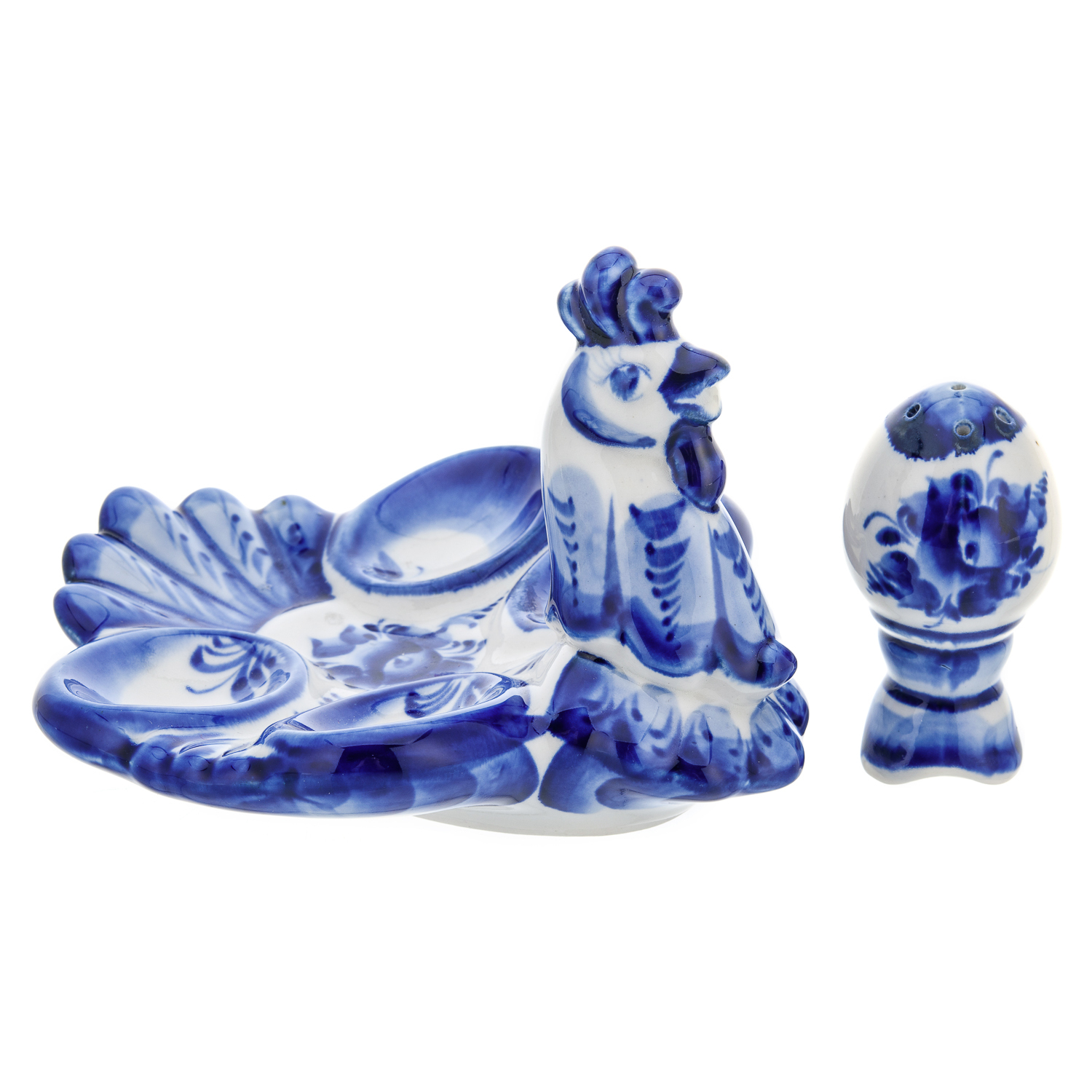 Пасхальница на 4 яйца «Курочка» с солонкой. Гжель.Высота: 9см, диаметр: 20см. В центре пасхальницы - миниатюрная солонка с крышечкой. Работа гжельского мастера - маленький шедевр для интерьера. Он украсит кухню или гостиную и будет красивым элементом деко
