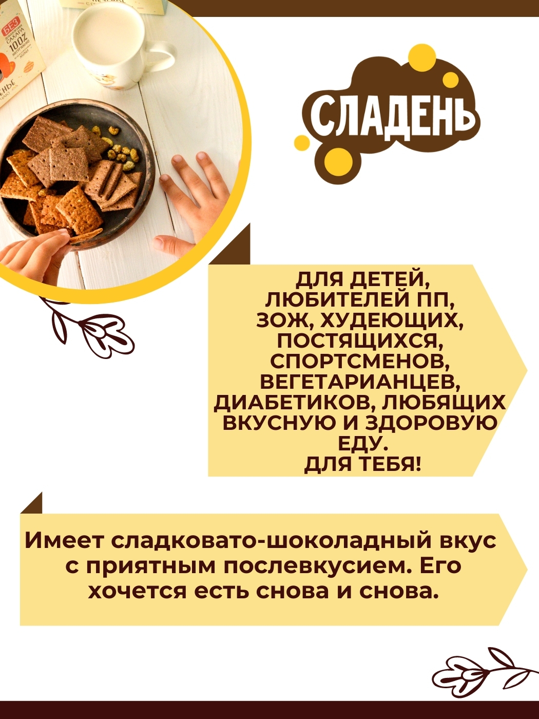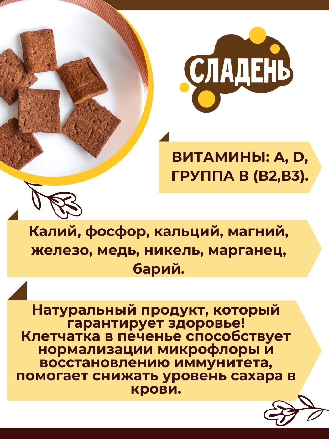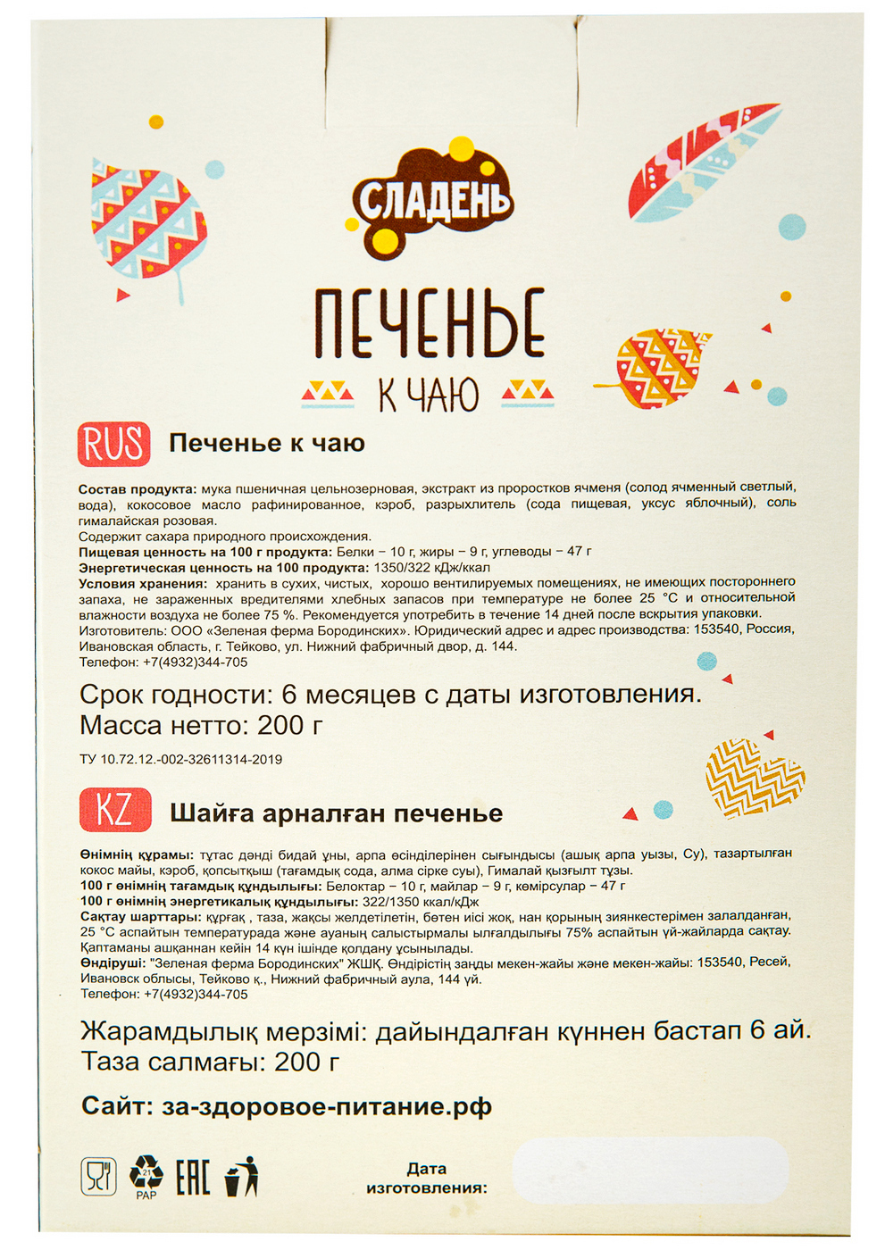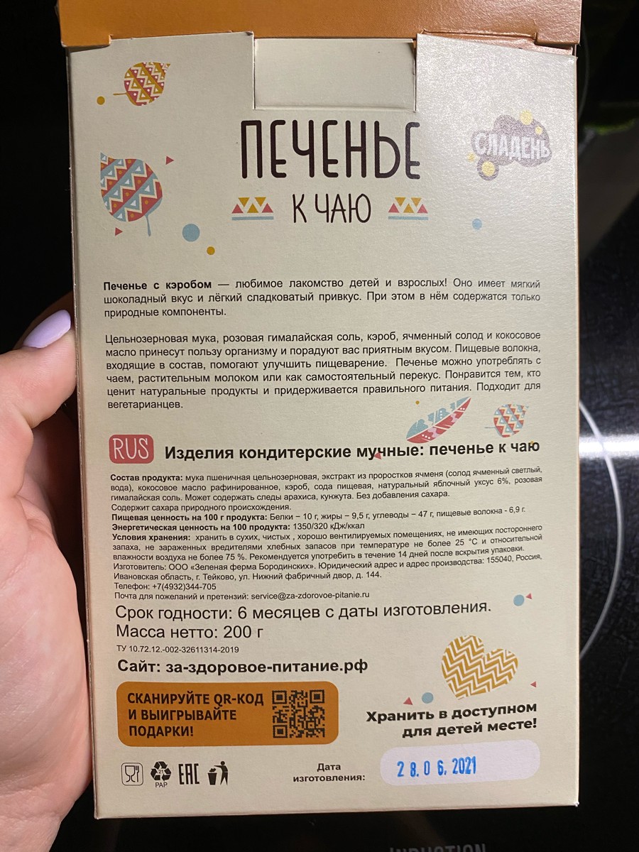 Условия хранения:Хранить в сухом, хорошо вентилируемом месте при температуре до 25 'С и относительной влажности воздуха не более 75%.Состав:Мука пшеничная цельнозерновая, кэроб, солодовый экстракт, кокосовое масло, вода, гималайская соль, разрыхлитель (со