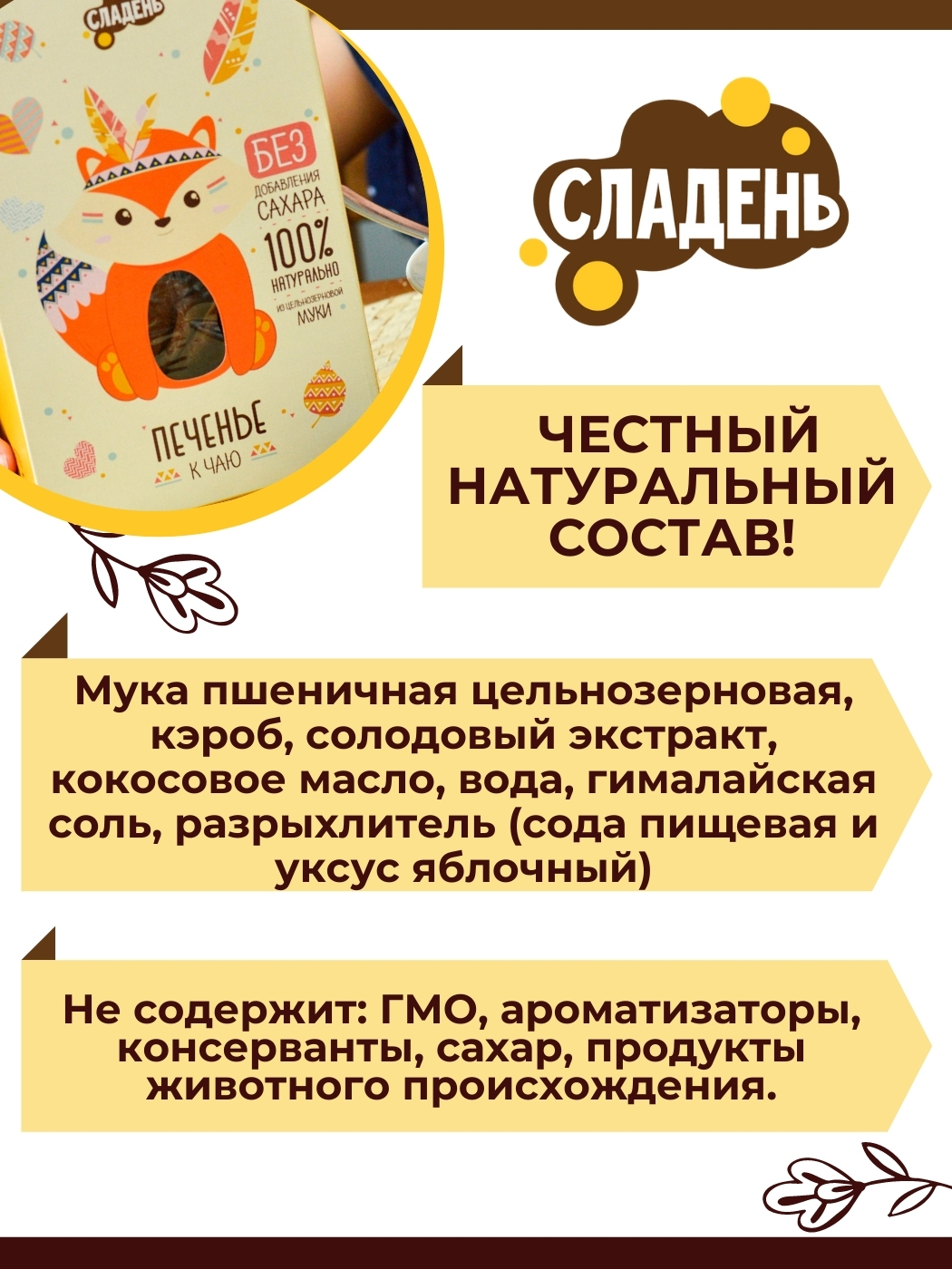 Не содержитПальмовое масло, ГМО, Консерванты, Искусственные красители, Ароматизаторы, Сахар, Искусственные добавки