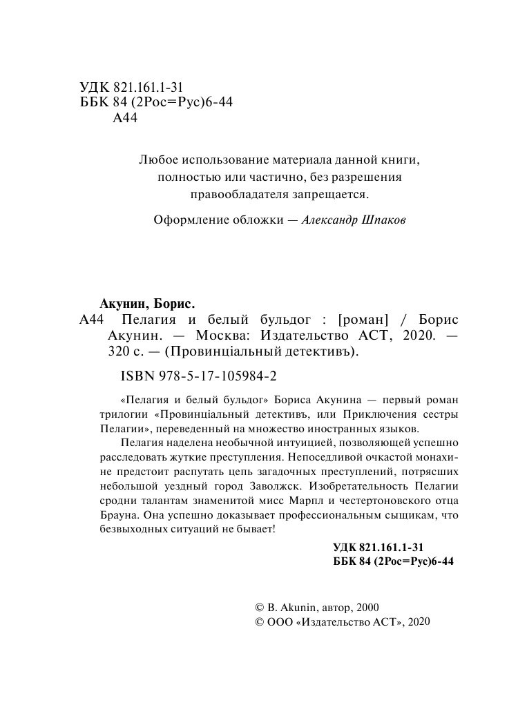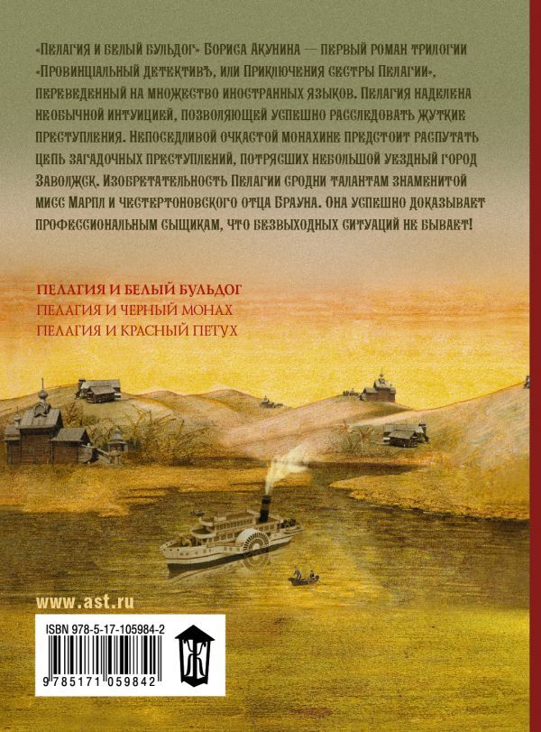Пелагия и белый бульдог" Бориса Акунина — первый роман трилогии "Провинцiальный детективъ, или Приключения сестры Пелагии", переведенный на множество иностранных языков.Пелагия наделена необычной интуицией, позволяющей успешно расследовать жуткие преступл