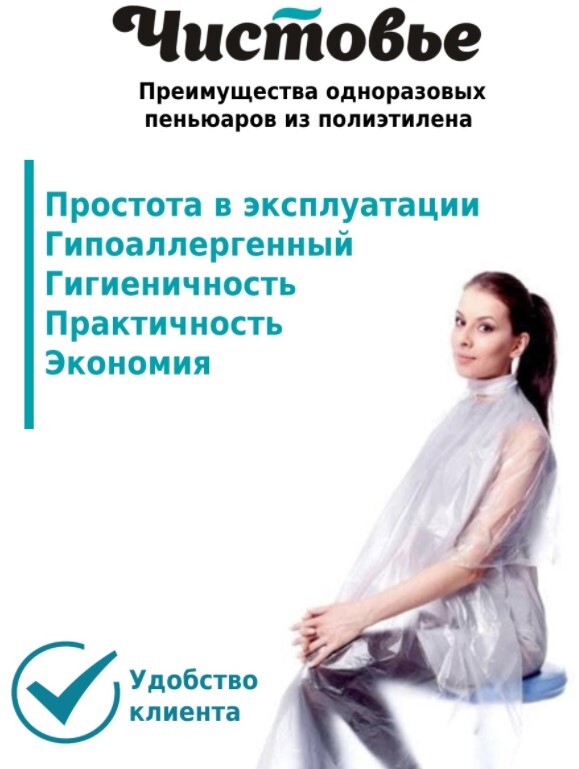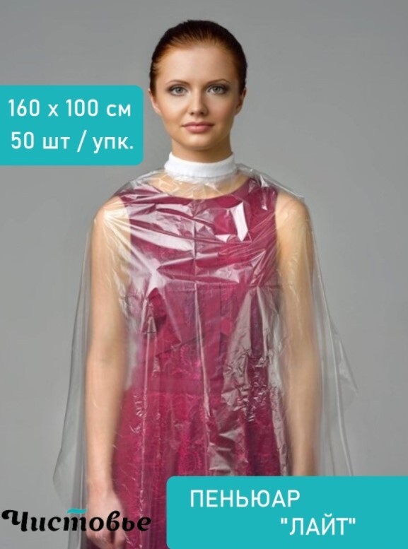 Пеньюары накидки для парикмахера Лайт Прозрачный 160 на 100 см. 50 штук в упаковке. Одноразовые накидки пеньюары из полиэтилена препятствуют попаданию воды, краски, лаков или других косметических веществ на одежду клиентов. Накидки одноразовые используютс