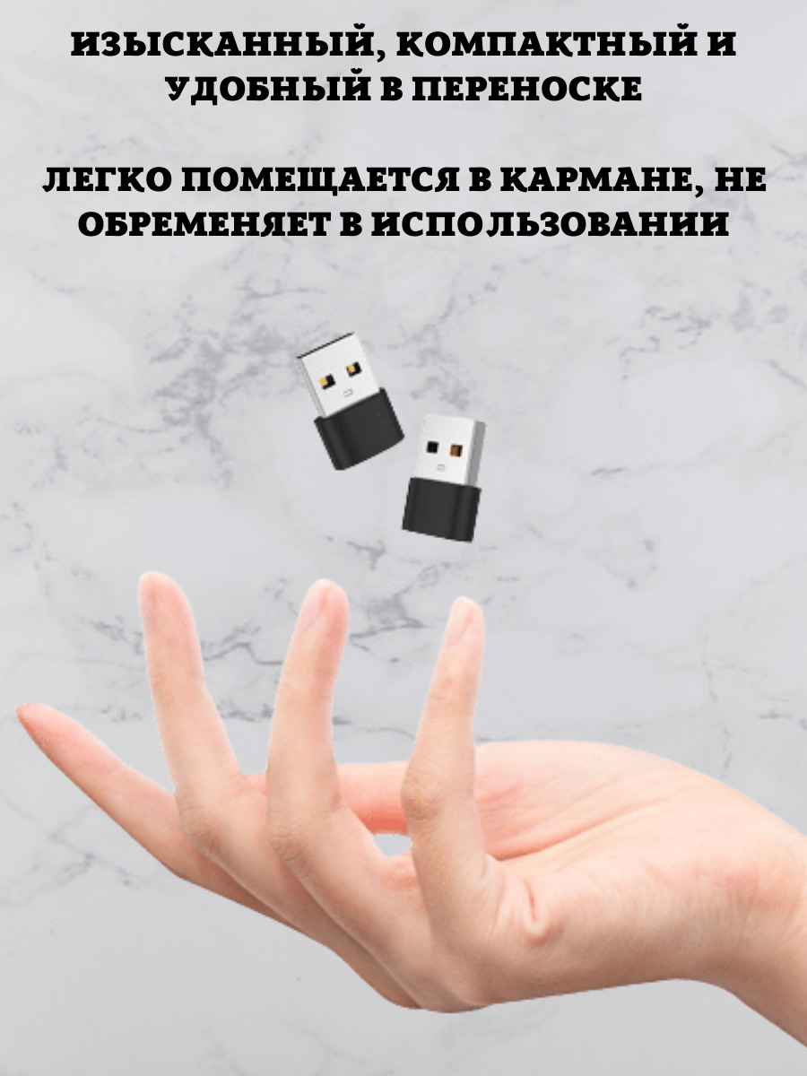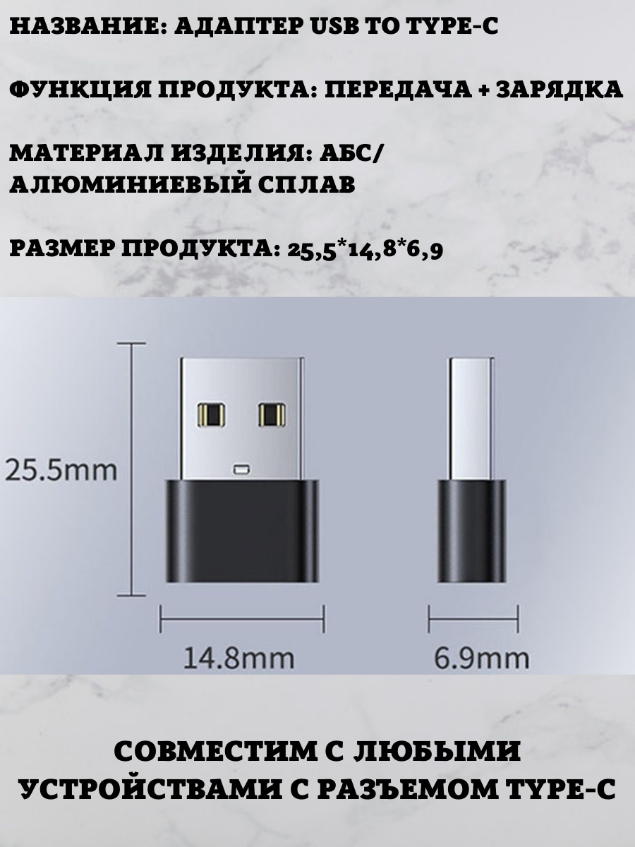 Переходник USB - Type-C чёрный.Компактный, подходит для подключения кабелей со штекером type-c в порты USB.Применяется для зарядки и передачи данных.Адаптер переходник для iPhone для iOs / Android (OTG) USB 2.0(папа/выход на Type-C(мама/вход) - миниатюрны