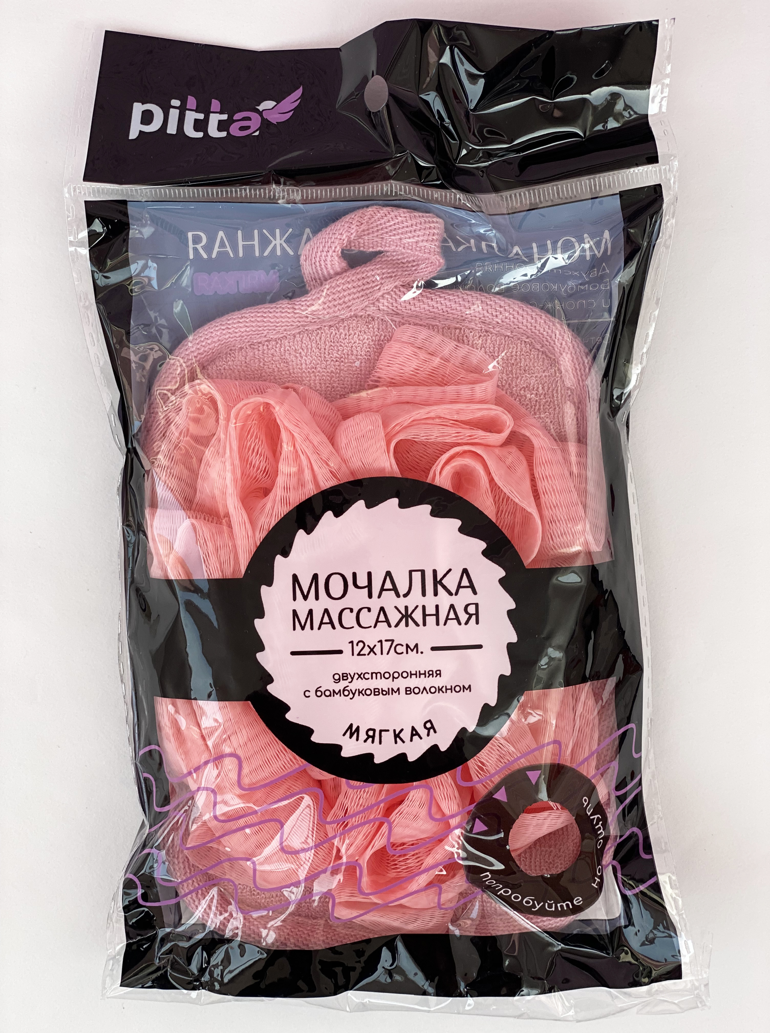 Мочалка для тела массажная мягкая двухсторонняя Pitta, с одной стороны имеет спонж-сетку, с другой - бамбуковое волокно.Сетчатая сторона из нейлона образует обильную пену, экономя гель для душа, мягко моет и отшелушивает.Сторона из бамбукового волокна обл