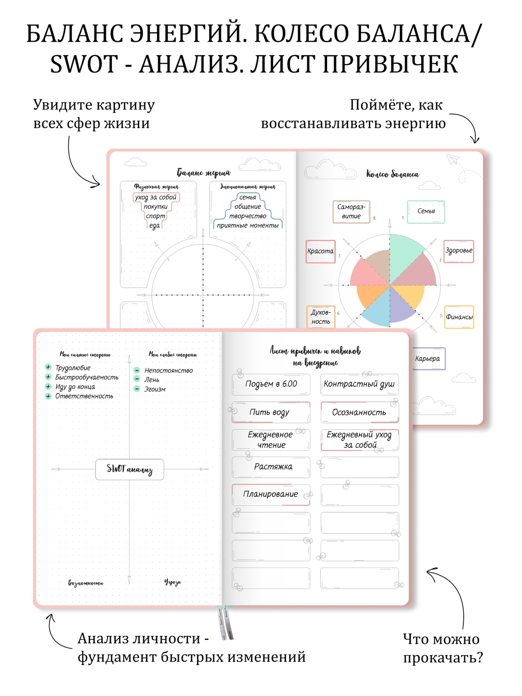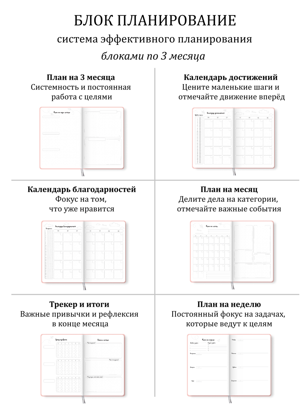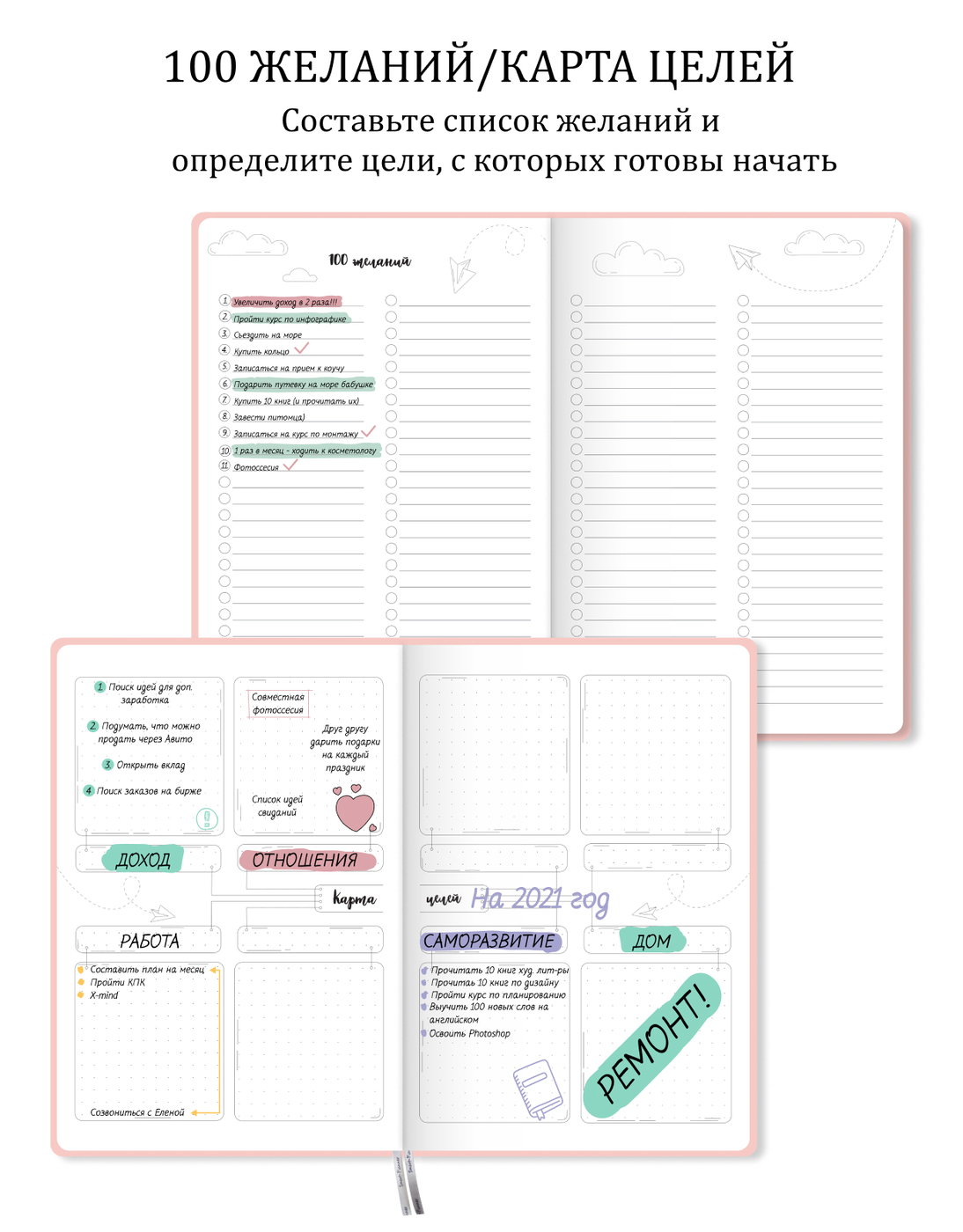 Как достичь за ГОД больше, чем за всю жизнь.Планер для эффективного достижения целей.На год, недатированный.К планеру прилагается гайд и курс по планированию. С ними вы сможете спокойно и уверенно, используя планер как рабочую тетрадь:1. Проанализировать