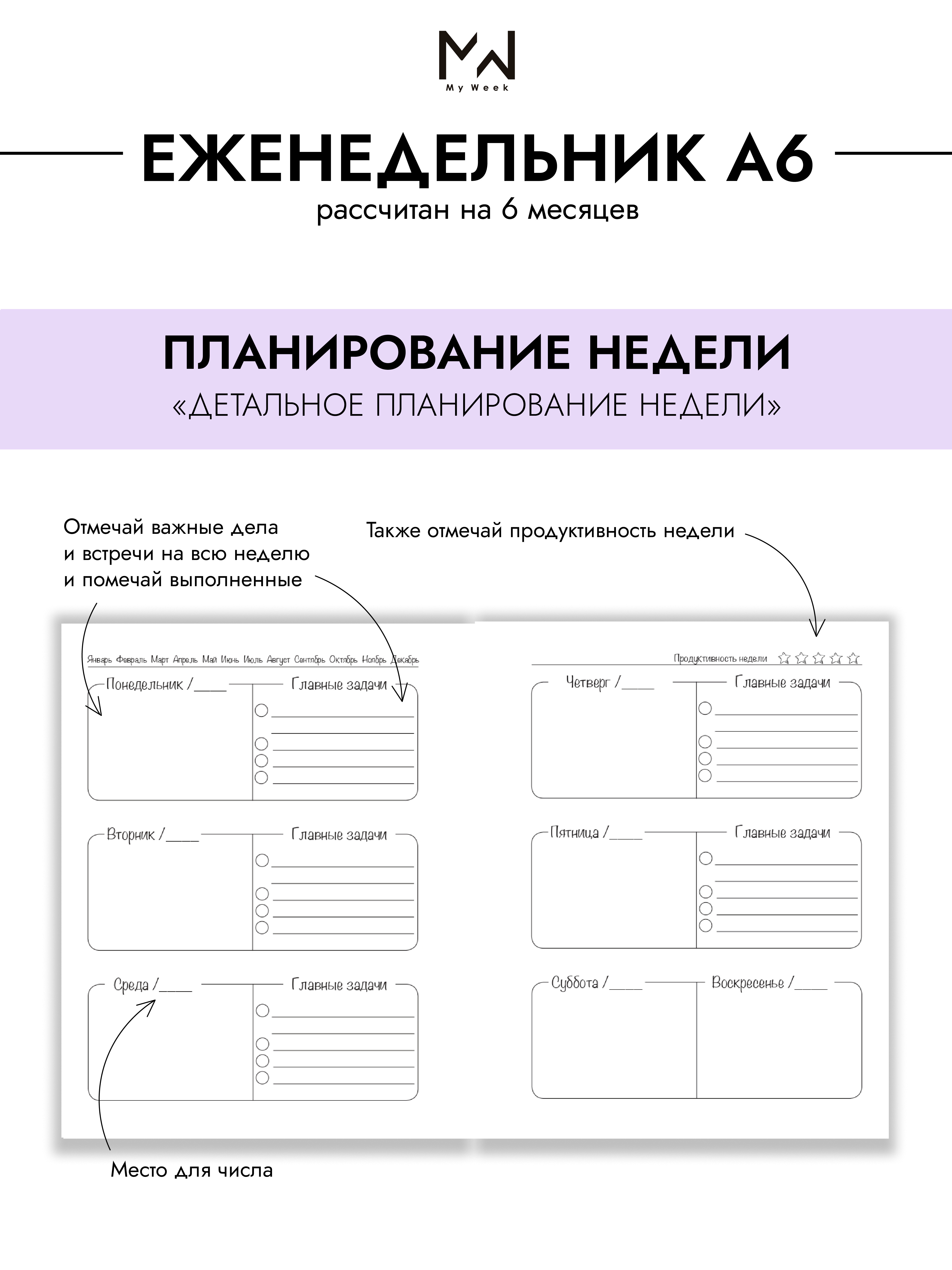 Комплектация:Ручка - 1 шт; стикеры - 1 лист; закладка- календарь 2022 - 1 шт; Еженедельник А6 недатированный - 1 штОписание:Продуктивными не рождаются, продуктивными становятся с планерами MyWeek. Планер А6 MyWeek — компактный носитель важных дел, целей,