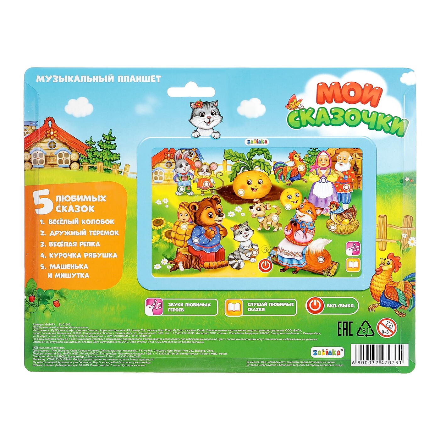 Музыкальный планшет расскажет малышу 5 известных русских сказок:«Весёлый колобок»,«Дружный теремок»,«Весёлая репка»,«Курочка Рябушка»,«Машенька и Мишутка».Чтобы выбрать сказку, нужно нажать на соответствующего персонажа. Если сменить режим, устройство вме