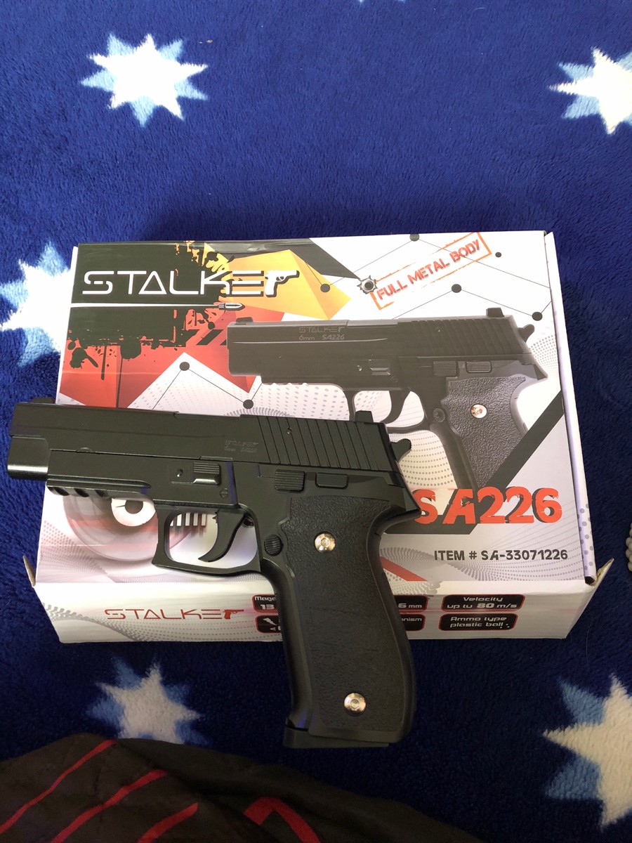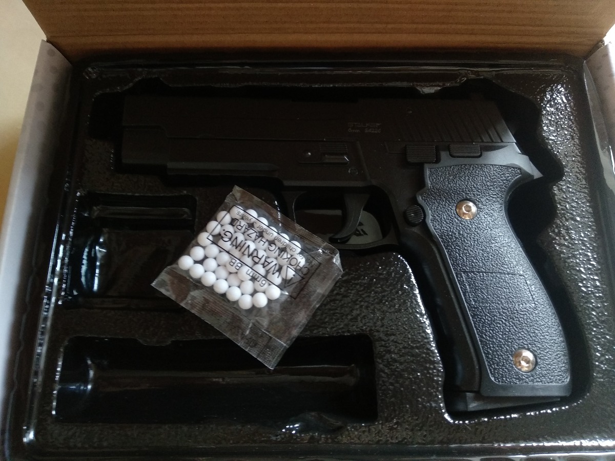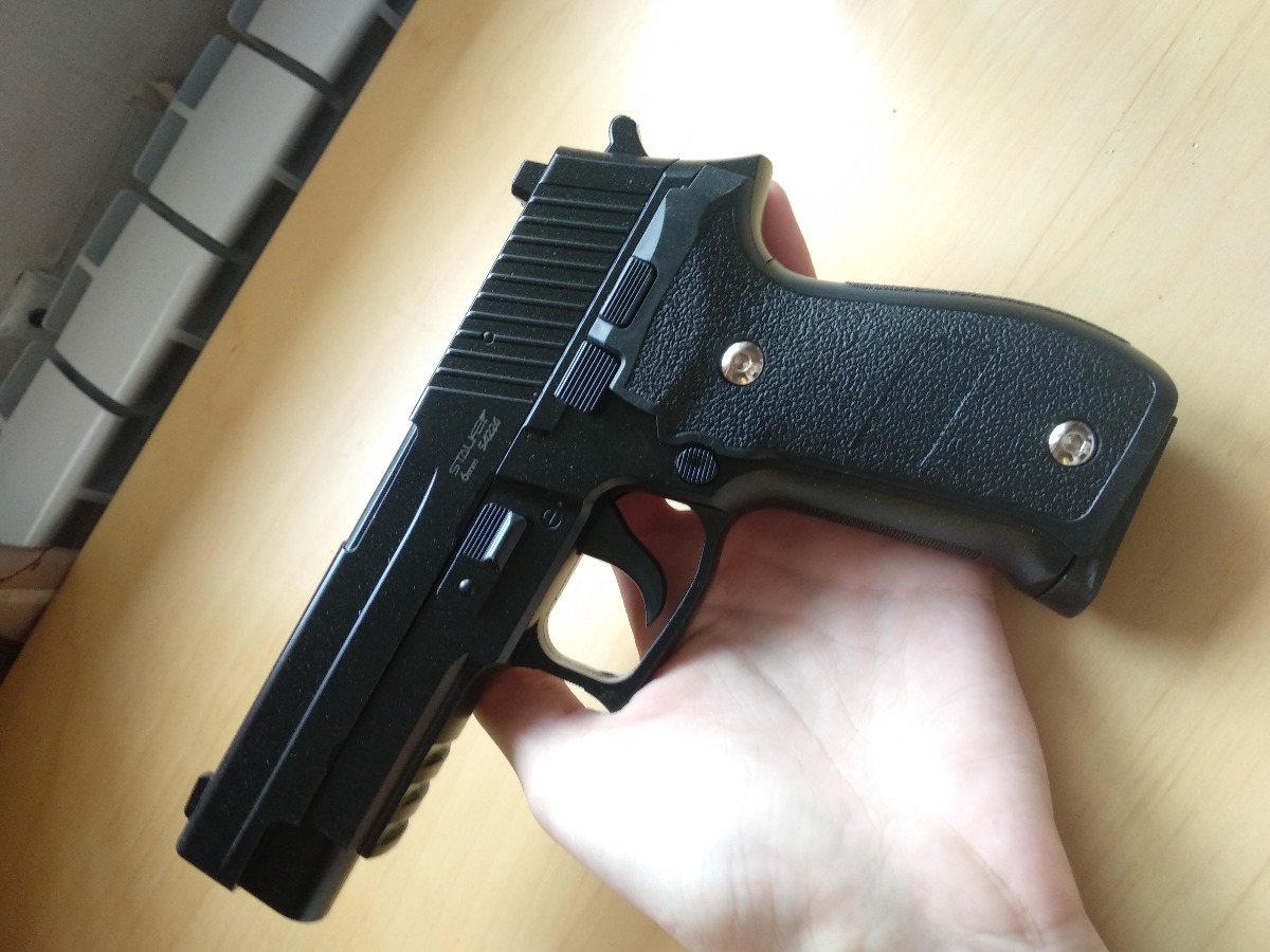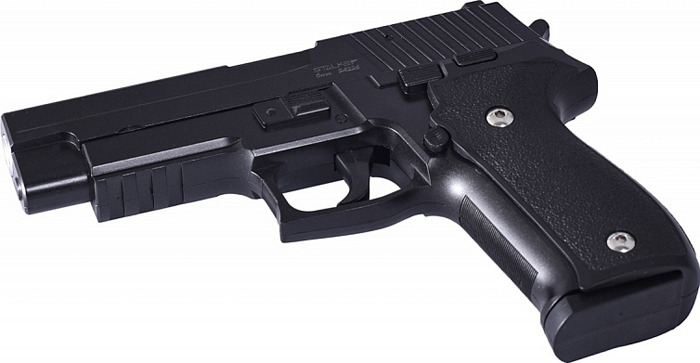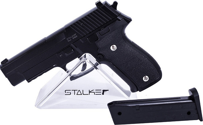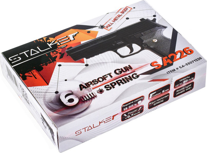 Пистолет пневматический Stalker SA226 Spring, калибр 6 мм, корпус - металл, магазин 13 шариков, до 80 м/с, черный, картонная коробка Вес, г: 570 Размеры, мм: 200 х 150 х 35 Емкость магазина: 13 шариков Цвет: черный Огнестрельный прототип: Sig Sauer P