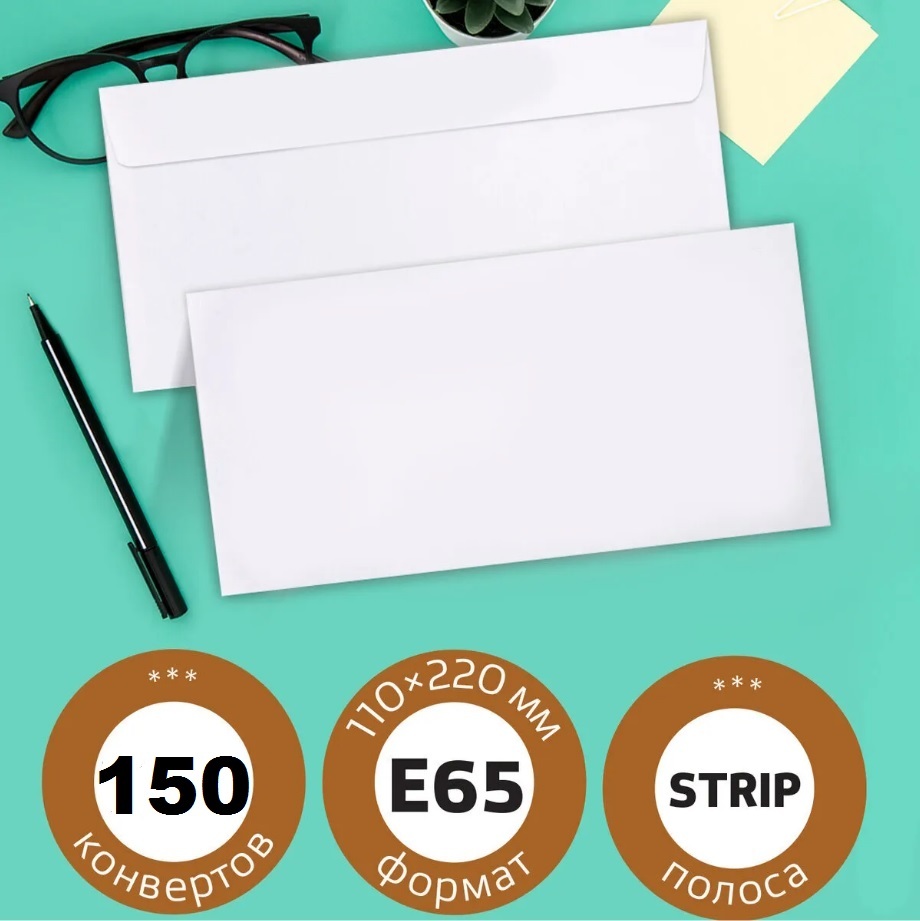 Комплектация:150 почтовых конвертов Е65 без надписейОписание:Особенности артикула: 150 почтовых конвертов; формат Е65 / DL (размер 110х220 мм); без подсказа (конверты чистые и без надписей, подсказ - это наличие печатных форм к заполнению на лицевой сторо