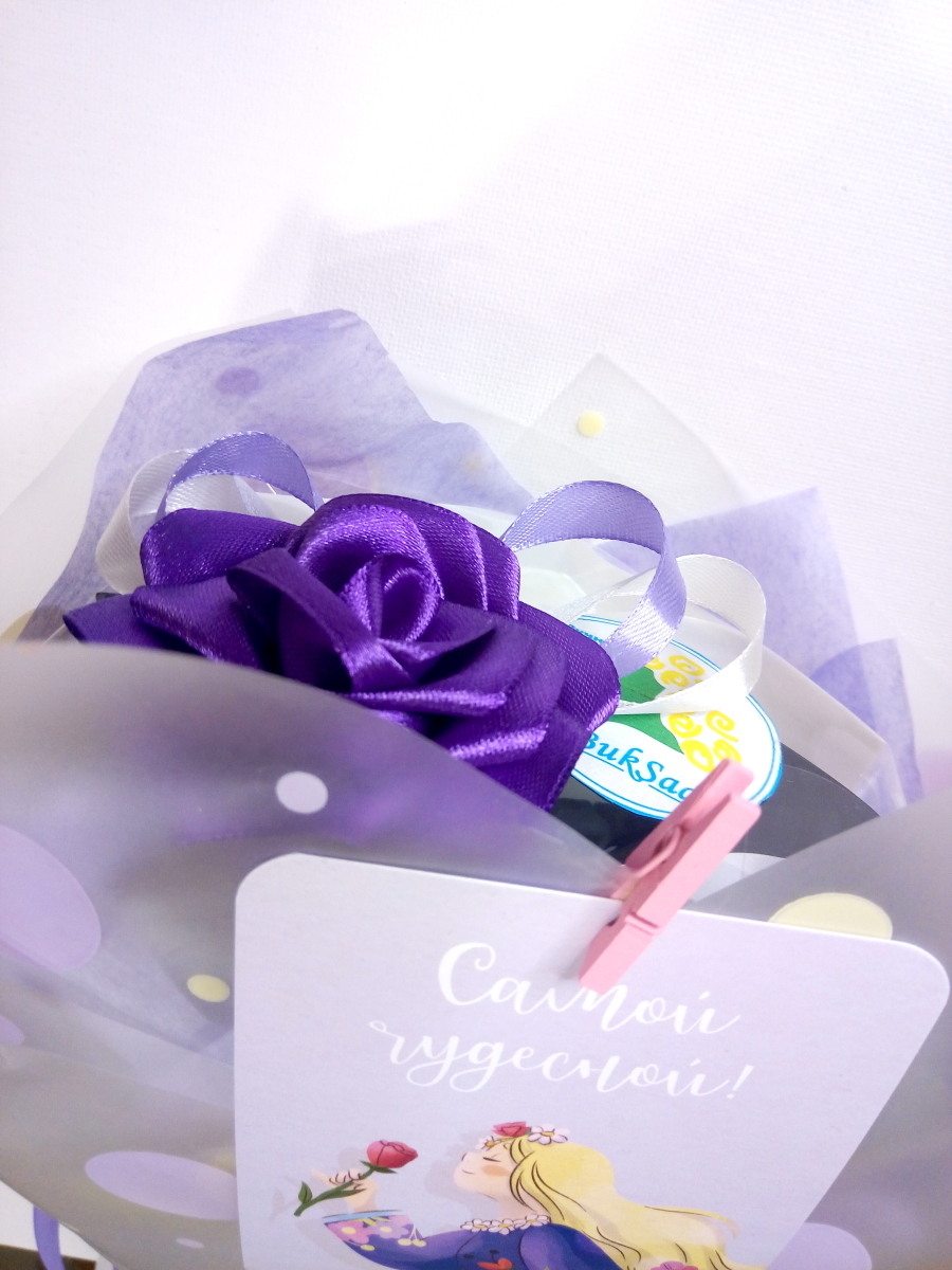 Состав:Подарочный букет для девушки. В состав набора входит: 1. Чай черный байховый цейлонский "Riston Ceylon Premium". Вес нетто: 50 гр. Упакован в герметичный zip пакет. 2. Рахат лукум (ассорти). Масса нетто: 125 гр. Упакован в герметичный zip пакет. 3.
