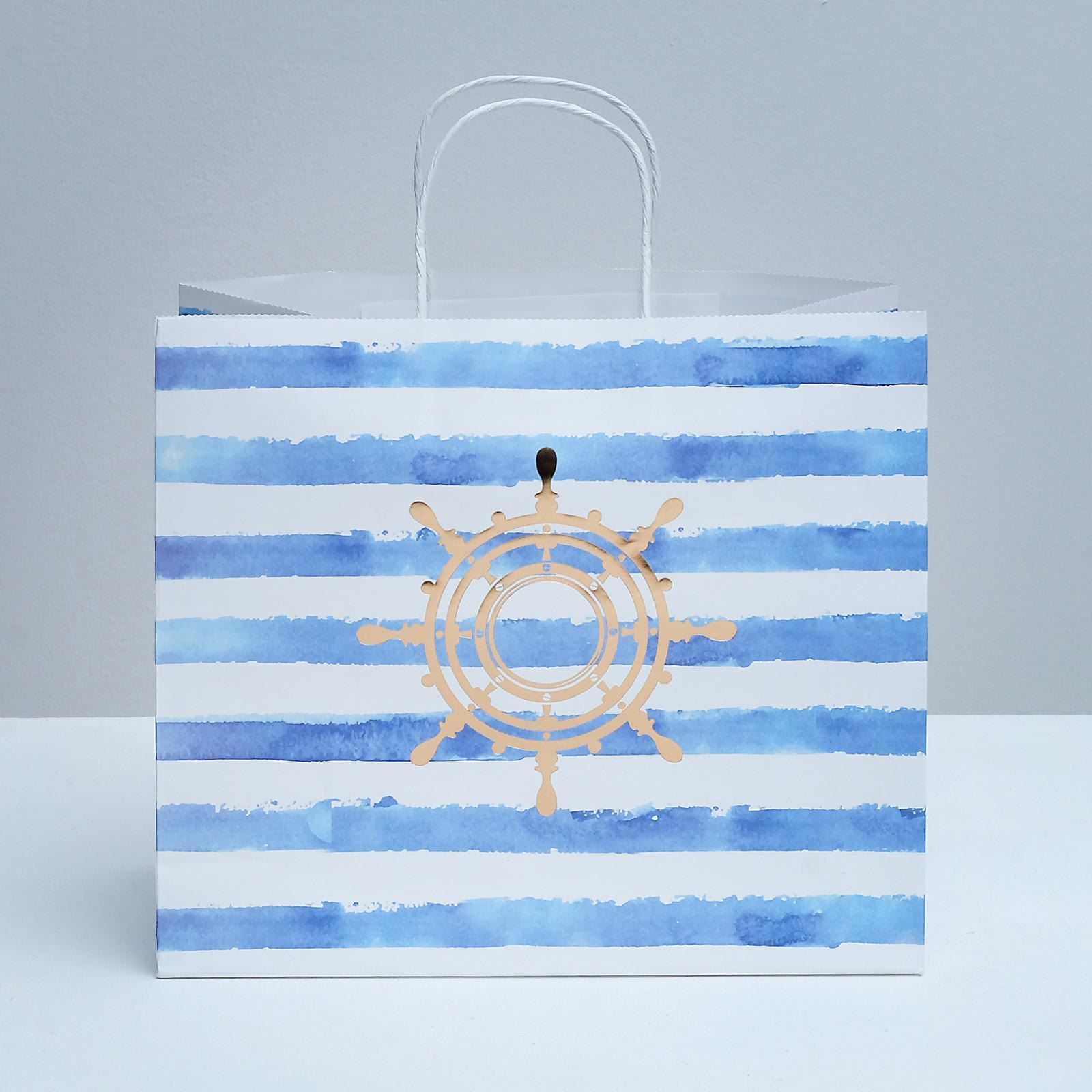 Комплектация:1шт. Пакет 32х28x15 смОписание:Большого размера 32х28x15 см. Крутой крафтовый, подарочный пакет с принтом "Штурвал" выполненный тиснением фольгой золотого цвета, горизонтальной ориентации, с ручками из крученого шпагата, крафт бумага высокой
