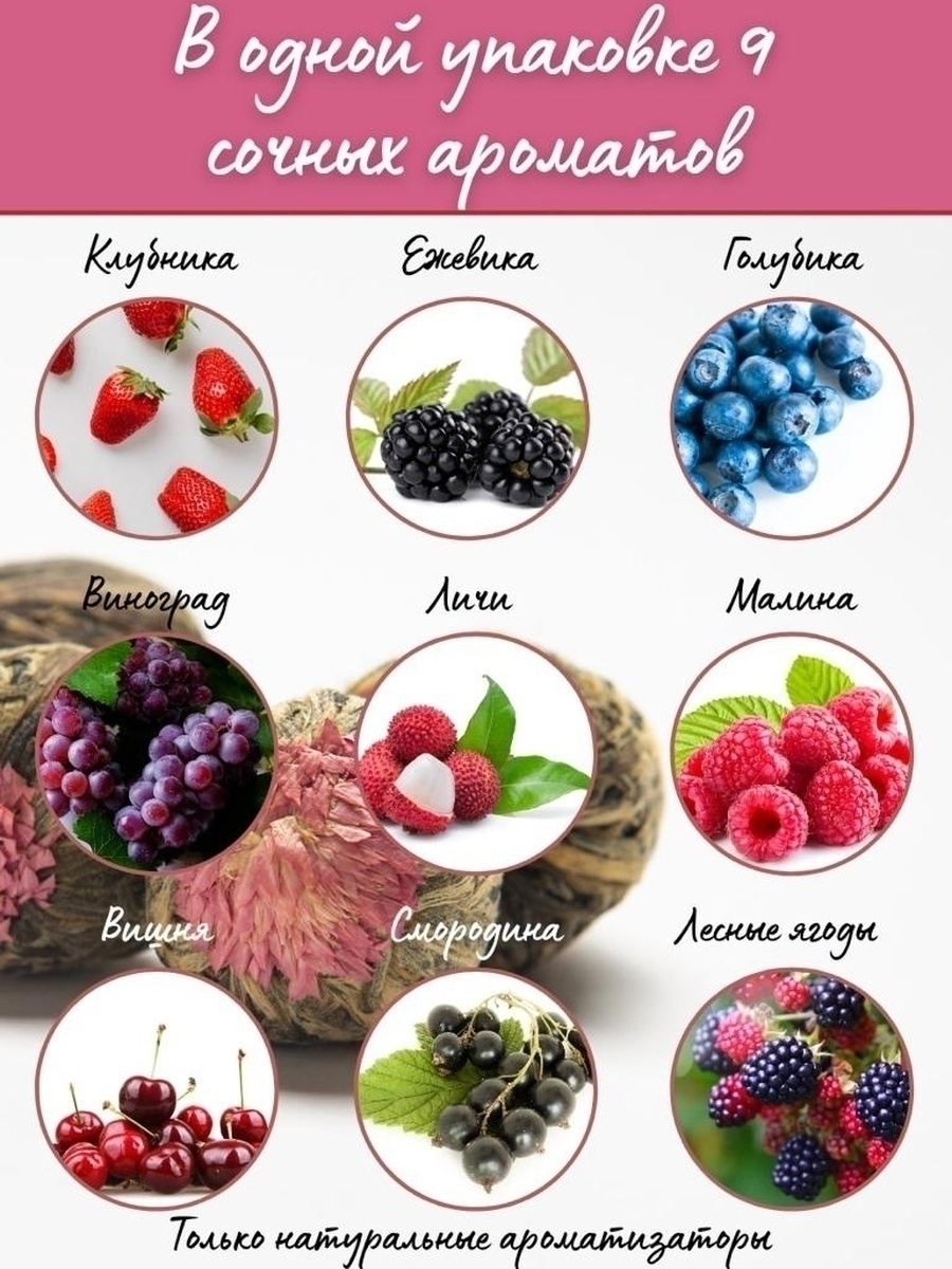 Условия хранения:В сухом помещении, влажность не более 70%Состав:Набор "Дикие ягоды" в красной коробочке состоит из 9 вкусов: клубника, ежевика, черника, малина, смородина, вишня, лесные ягоды, личи, виноградКомплектация:- Связанный чай: клубника, ежевика