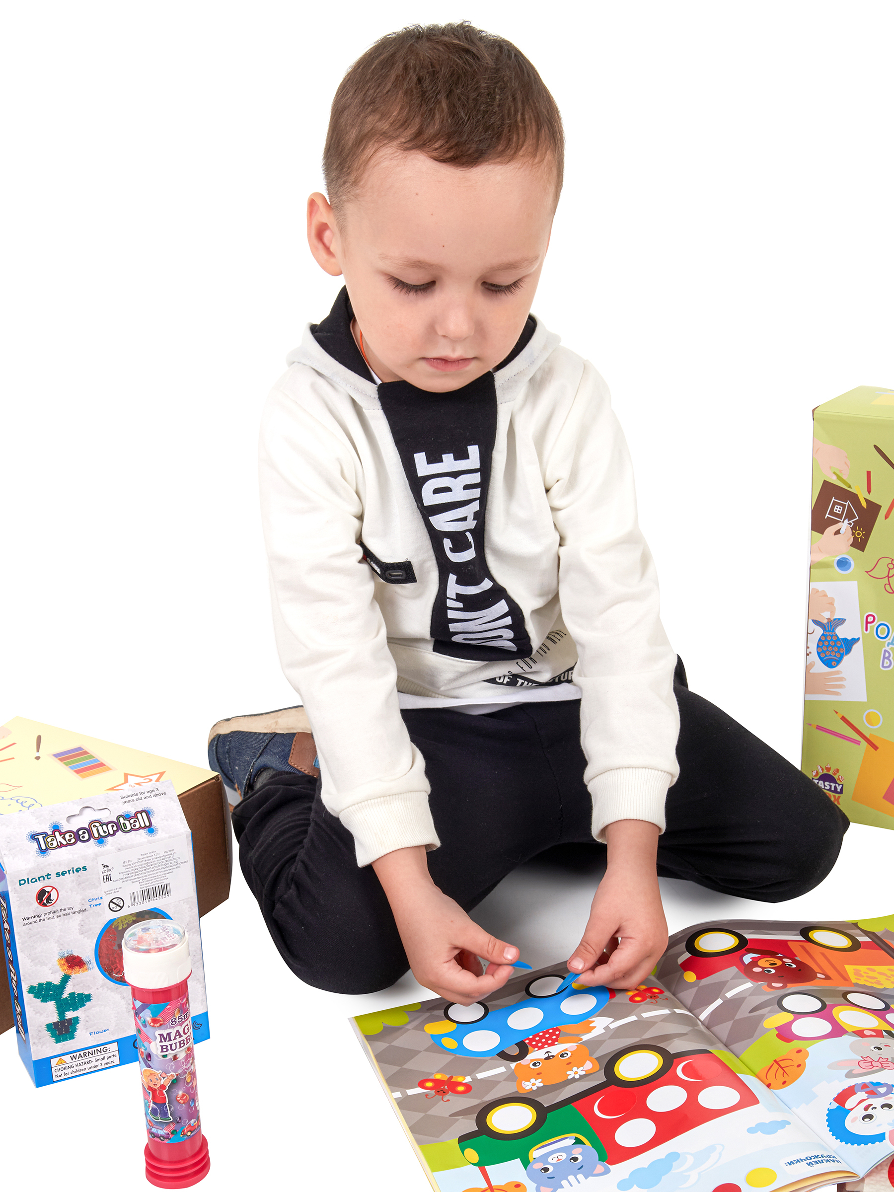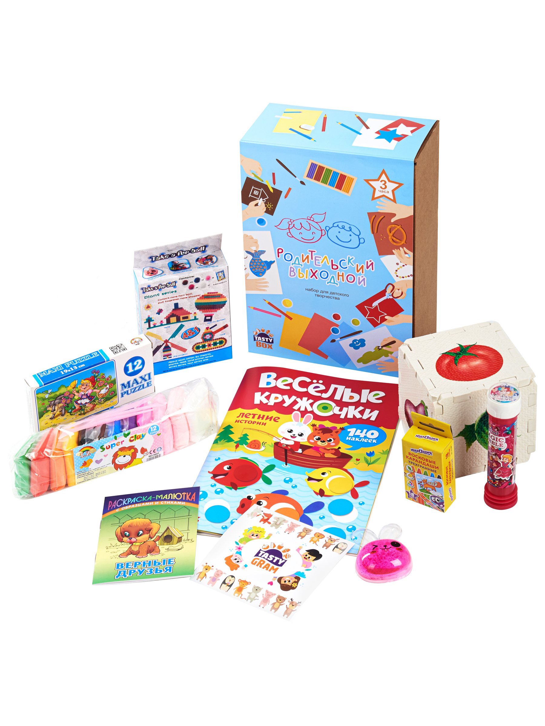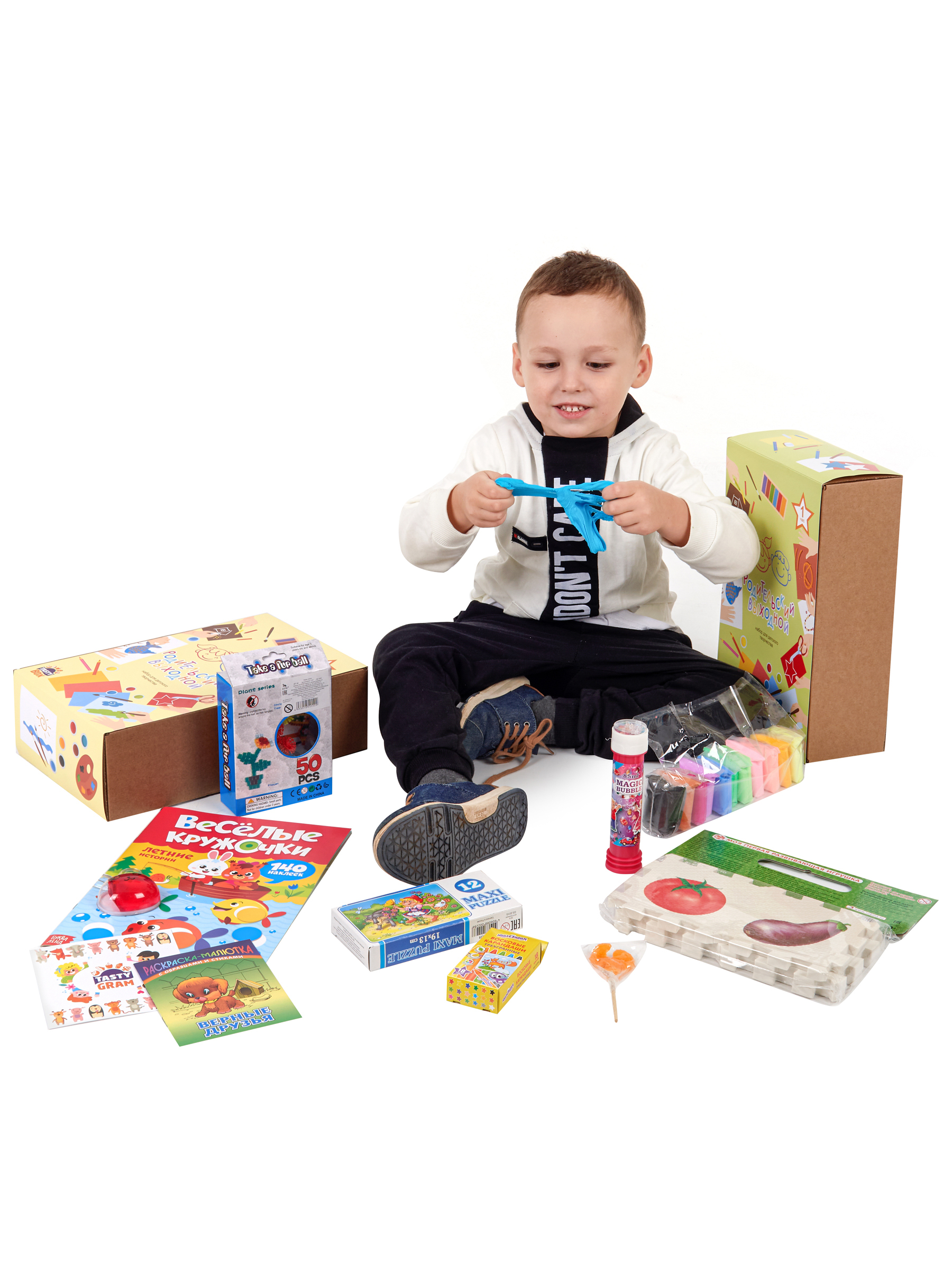 Комплектация:Раскраска, восковые карандаши, воздушный пластилин, КУБ «Овощи», пузыри, слайм, Maxi пазл, конструктор липучка, книжка с наклейками наклей кружочки правильно, леденец "Петушок" на палочке, открытка