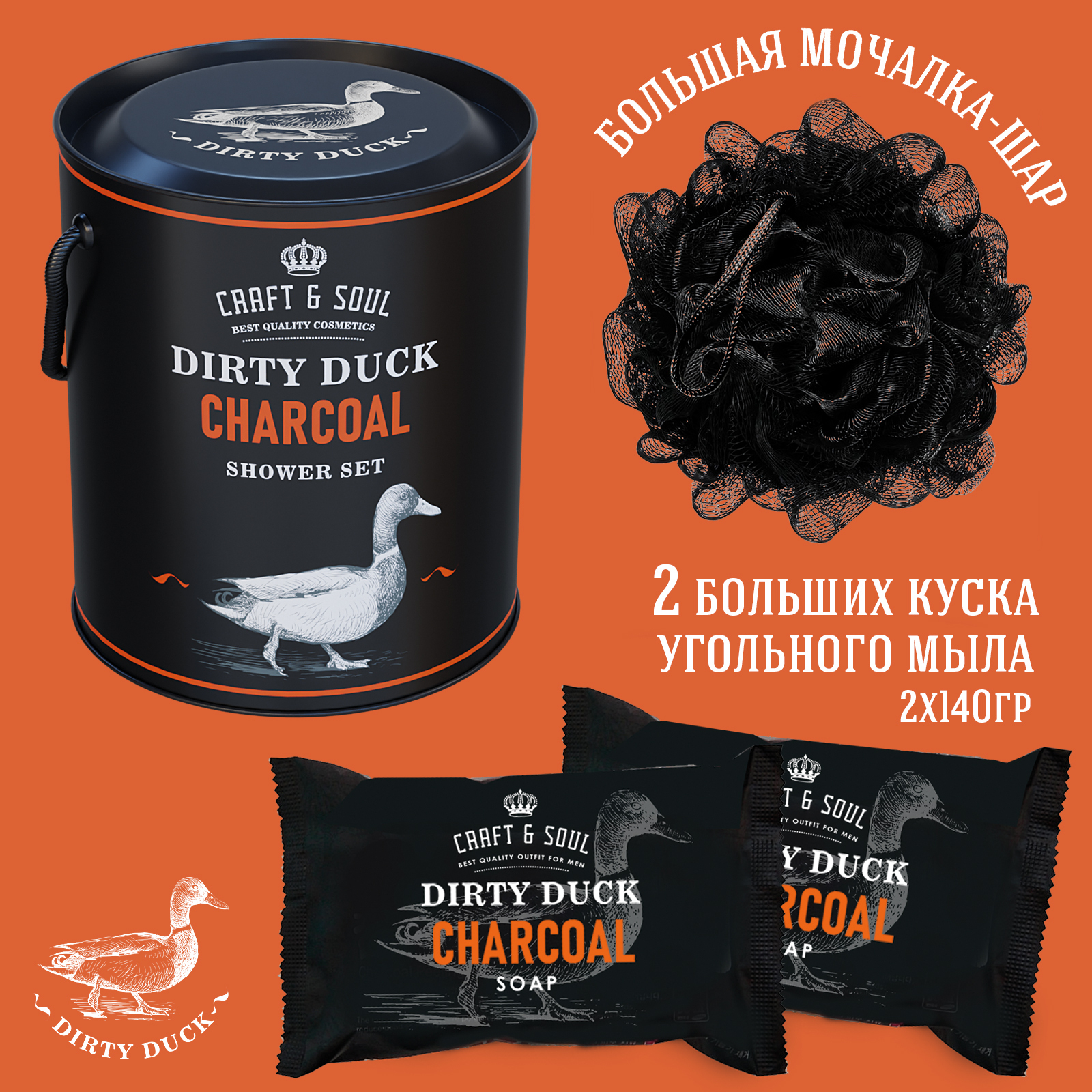 Подарочный набор для мужчины на 23 Февраля! от Ирладнского бренда DIRTY DUCK.Самый оригинальный, самый полезный, самый стильный.Набор для душа состоит из трех предметов.Крафтового черного мыла с оливковым маслом, DIRTY DUCK BLACK. 2 шт. по 140 гр.Большой