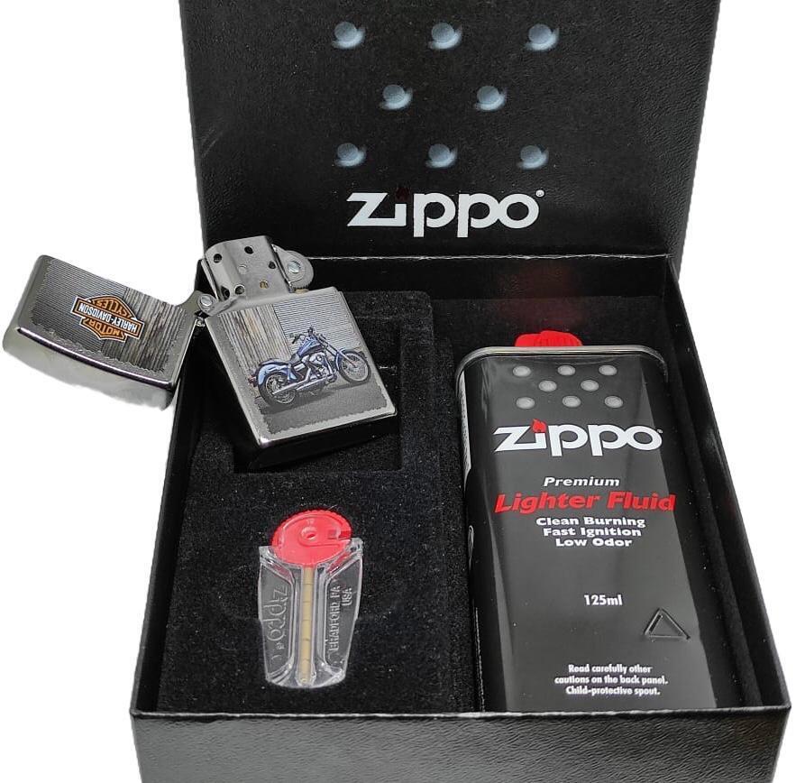 Подарочный набор Zippo – прекрасный способ преподнести в подарок шикарную ветроустойчивую зажигалку Zippo.Подарочный набор включает в себя:Зажигалка ZIPPO 207 HARLEY BIKES, серебристая с покрытием Street ChromeТопливо 125 млКремниСертифицированный товарПо