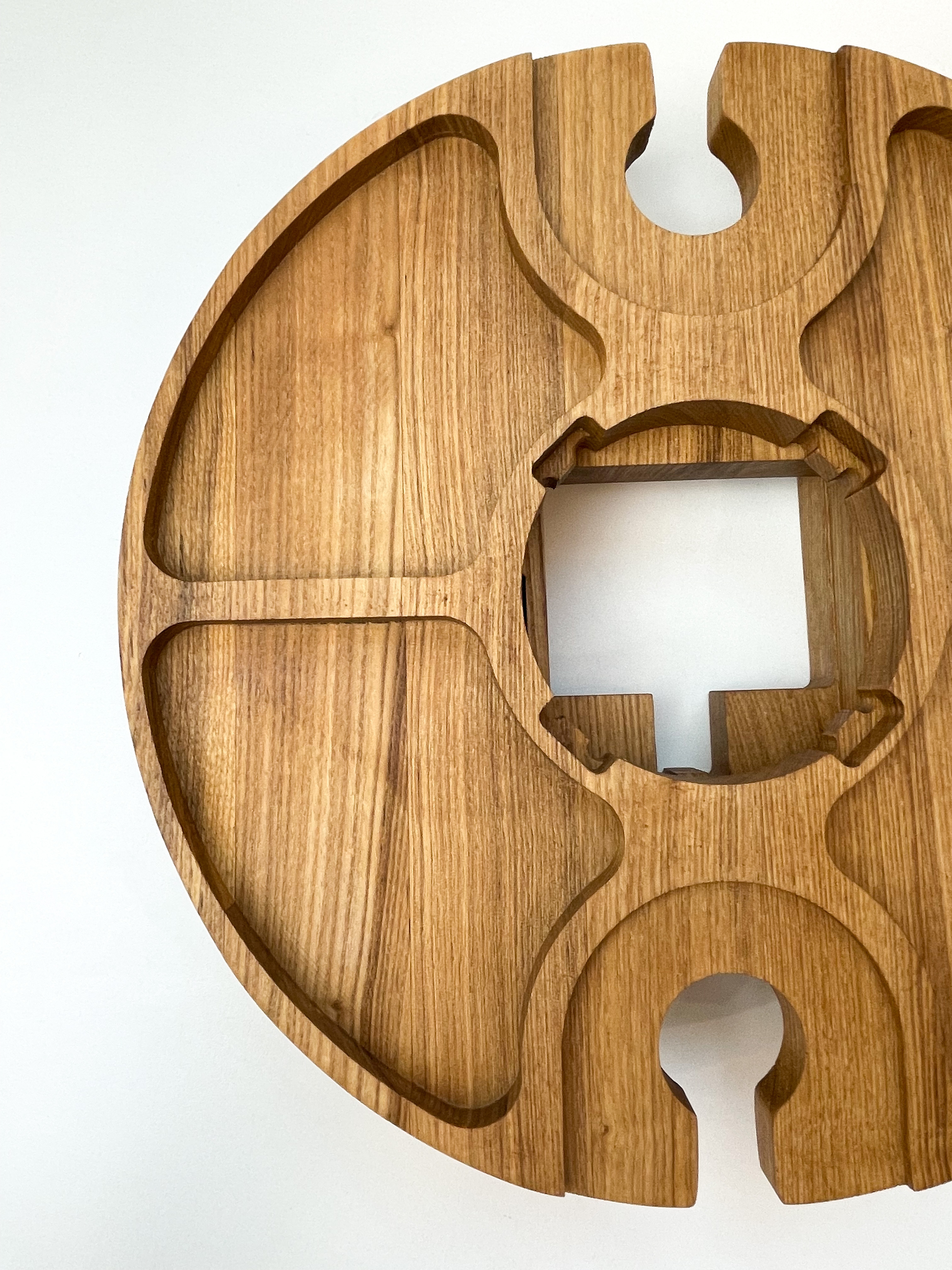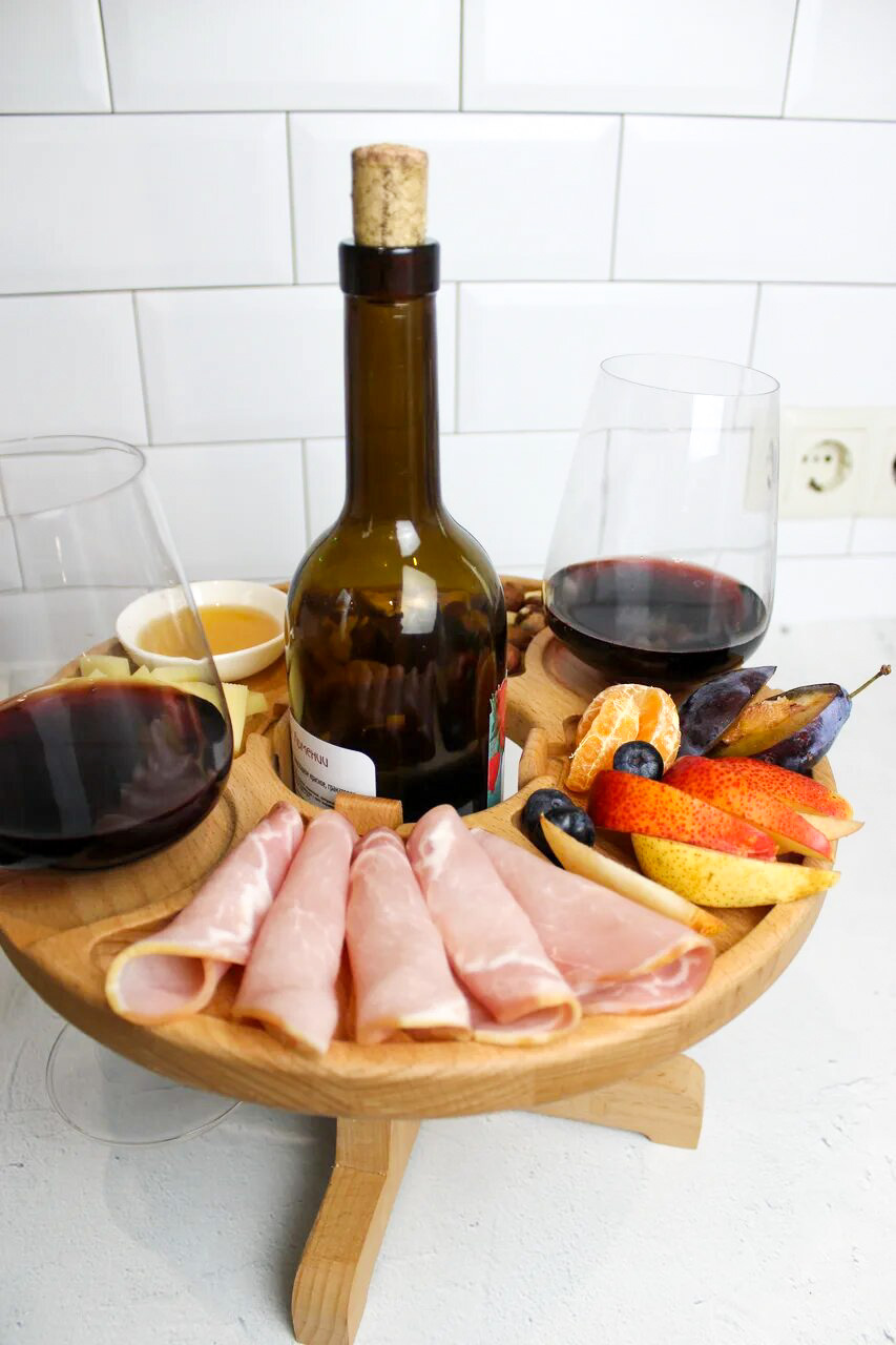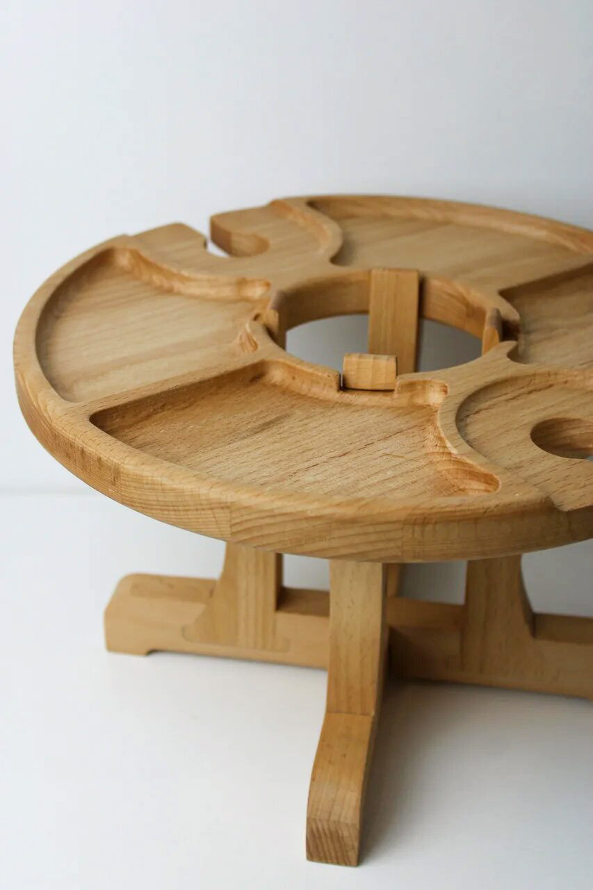 Комплектация:Складной винный столик из ясеня - 1штОписание:Складной винный столик диаметром 30 см на 2 бокала с отверстием под бутылку вина или шампанского. Винные столики пользуются популярностью среди любителей эстетичной и многофункциональной посуды. С