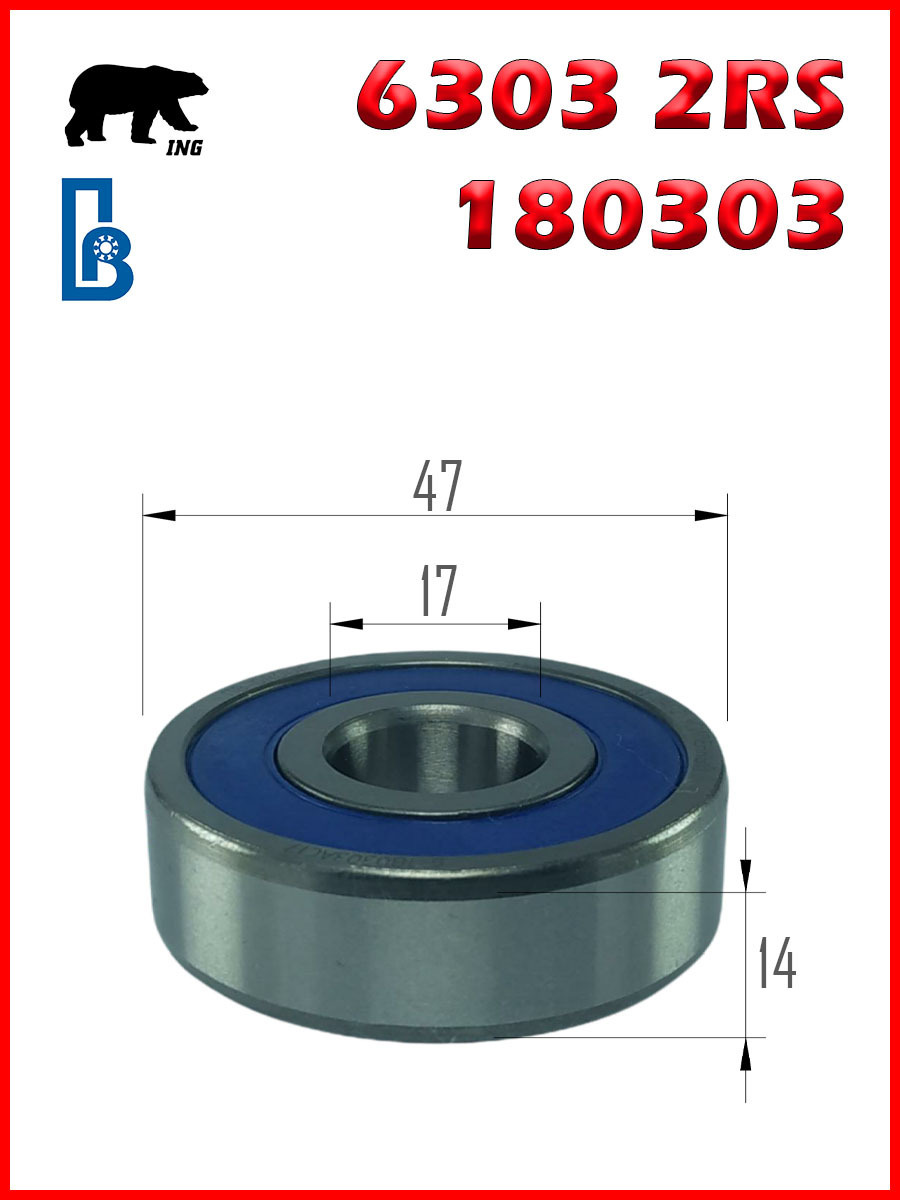 Шариковый радиальный однорядный закрытый с двух сторон. Имеет обозначение 6303 2RS в соответствии с ISO и 180303 в соответствии с ГОСТ. Выдерживает радиальную нагрузку. Наружный диаметр (D), 47 мм, внутренний диаметр (d), 17 мм, общая ширина (B), 14 мм. Г