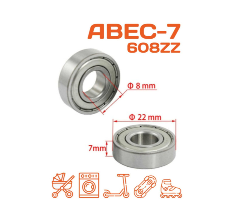 Долговечные надежные металлические подшипники, выдерживают большие нагрузки. Превышают по соотношению цена-качество все остальные аналоги. Подходят как: подшипник для самоката, для скейтборда, для лыжероллеров, для роликов, для спинеров, для электроприбор