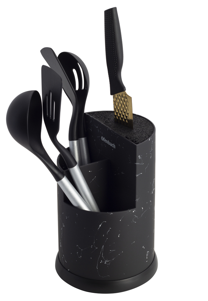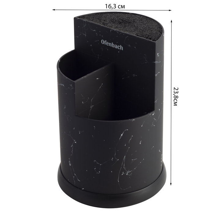 Подставка для ножей и кухон. принадлежностей тройная Размеры: 16,3*23,8см. Материал: ПП. Цвет: черный мрамор. Крутящееся основание. Подходит для посудомоечной машины