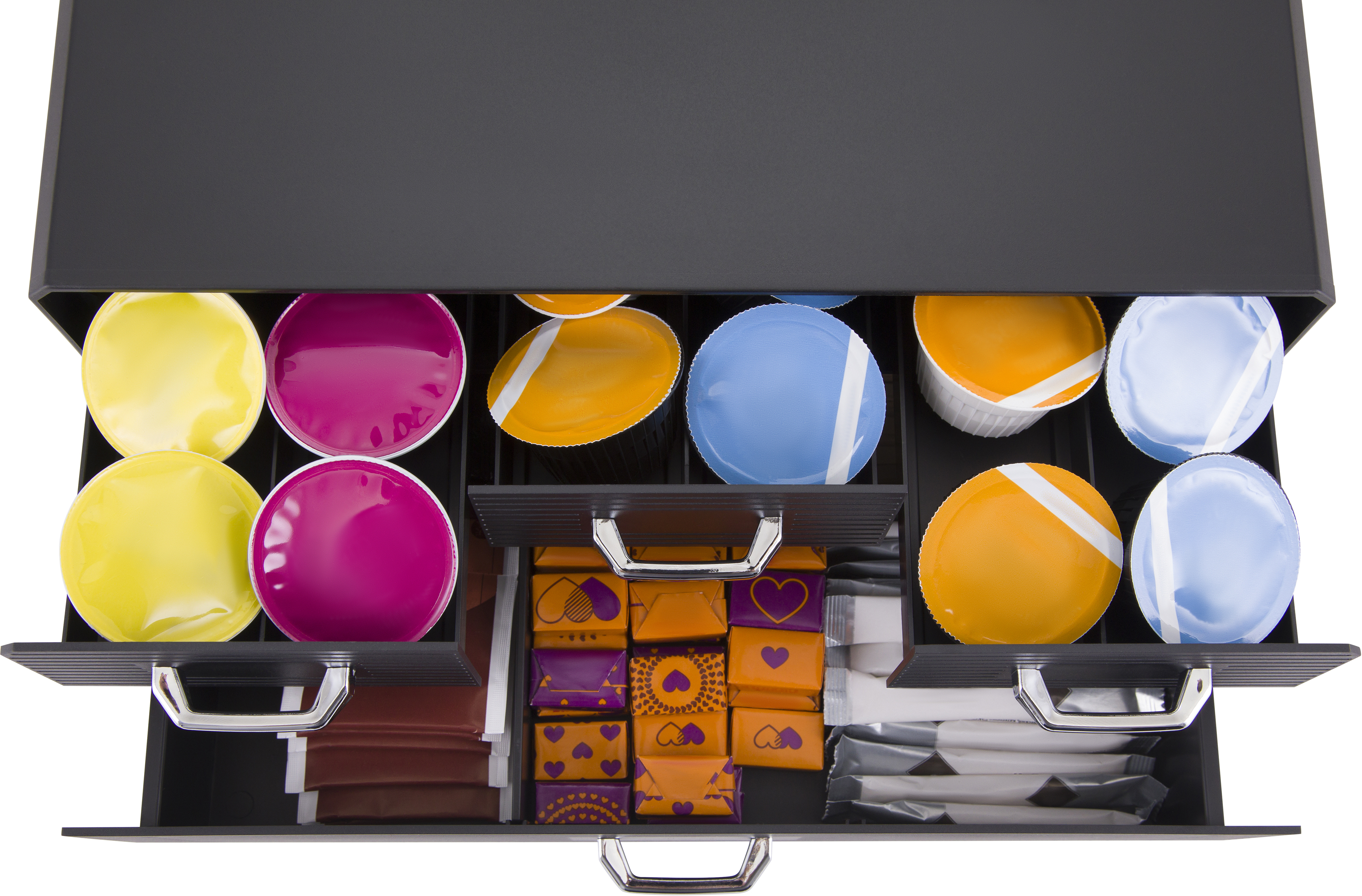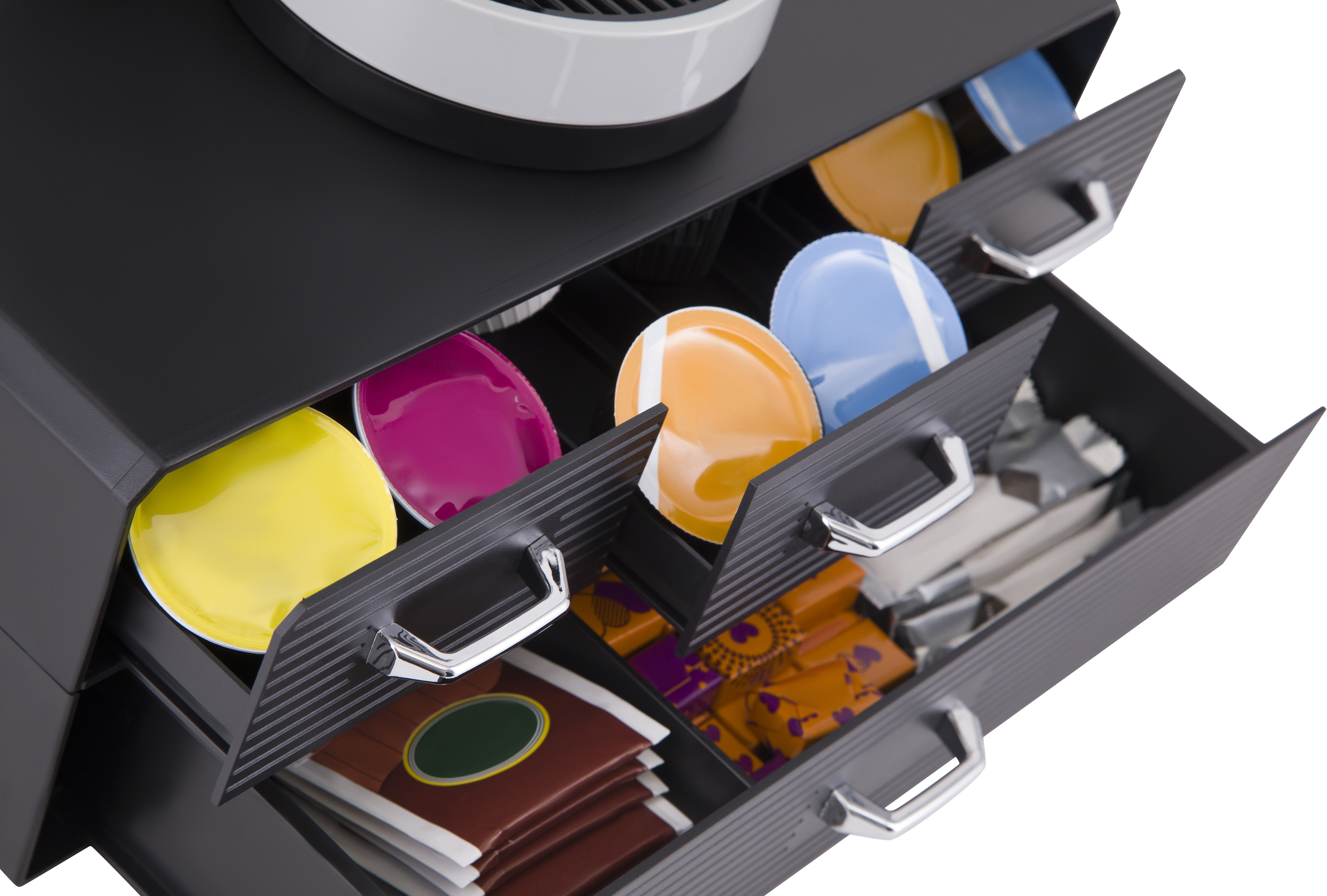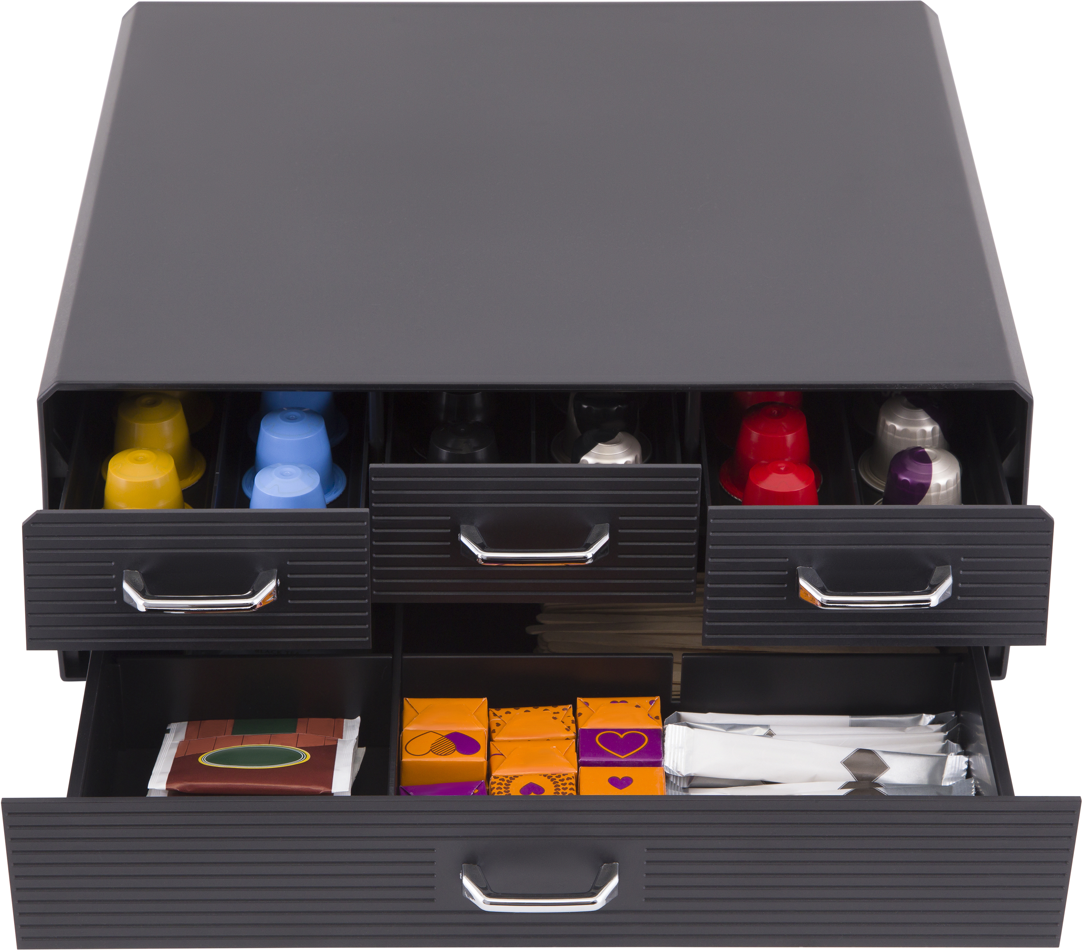 Двухъярусный настольный органайзер-подставка для 96 кофейных капсул Nespresso или 61 Dolce Gusto с четырьмя выдвижными ящиками. Нижний ящик адаптируется под ваши потребности благодаря разделителям и может использоваться не только для хранения капсул, но т