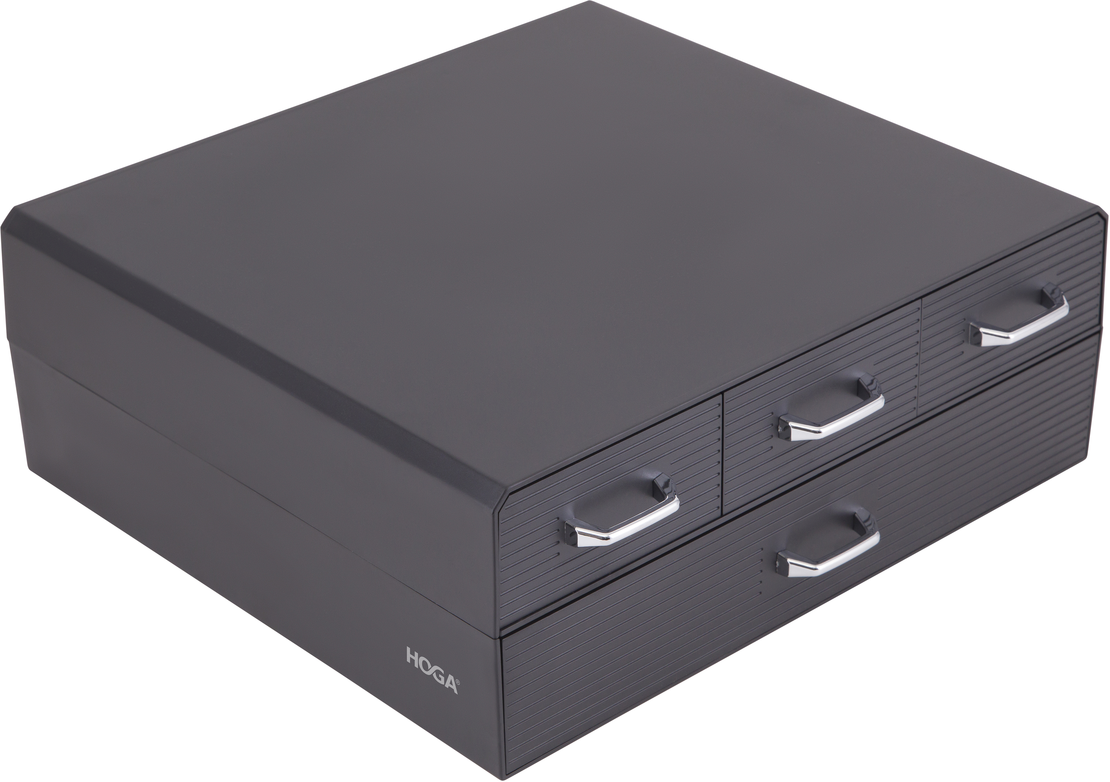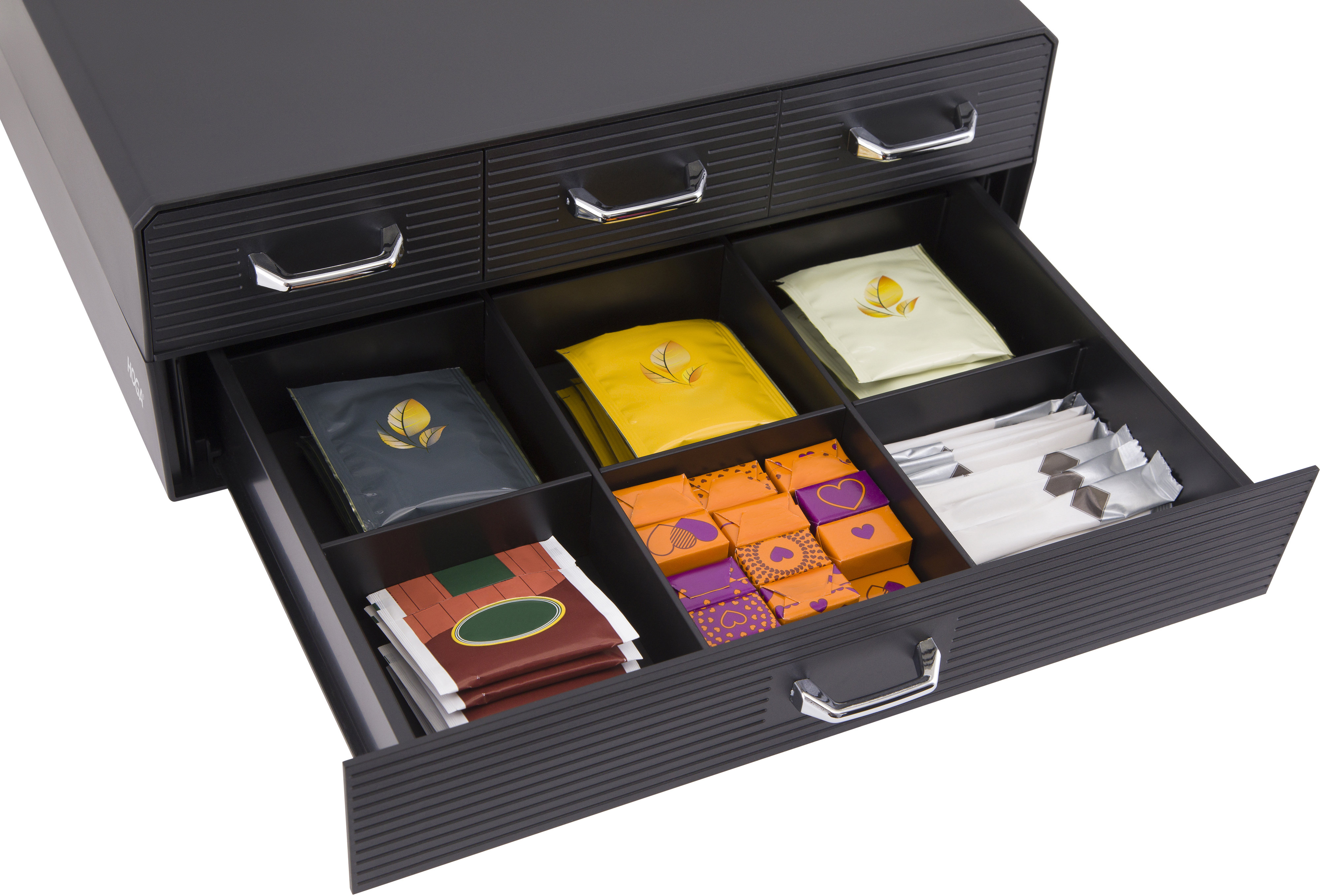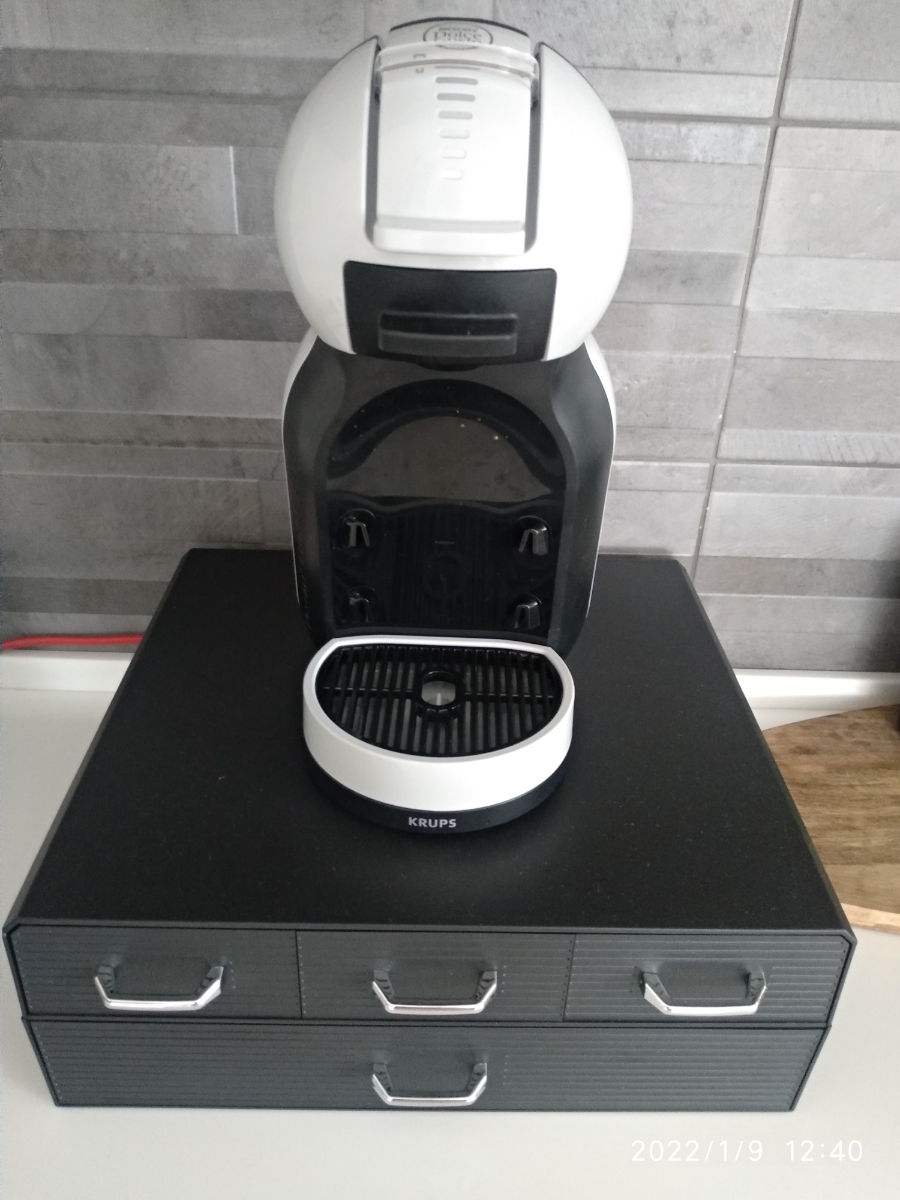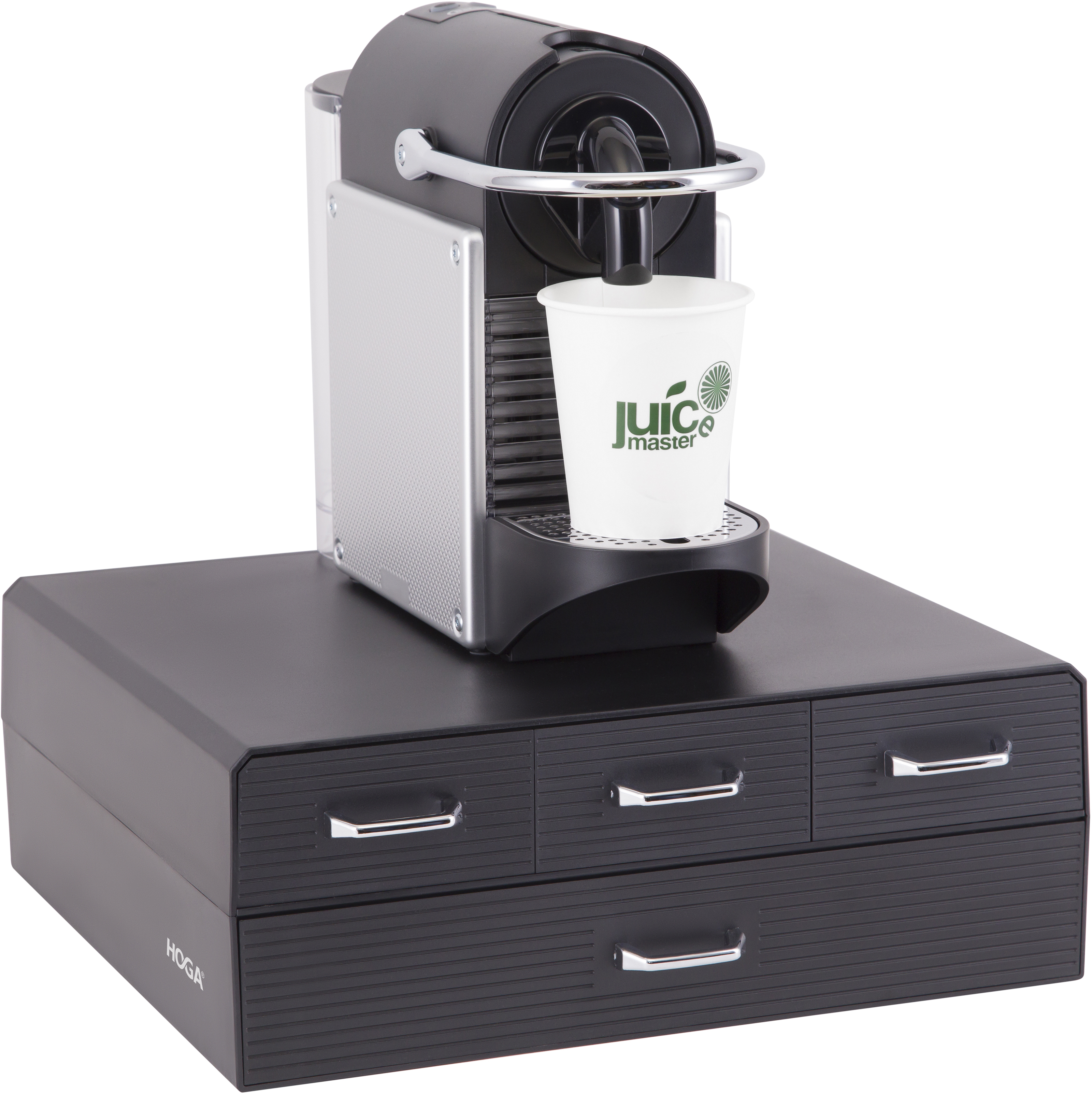 Двухъярусный настольный органайзер-подставка для 96 кофейных капсул Nespresso или 61 Dolce Gusto с четырьмя выдвижными ящиками. Нижний ящик адаптируется под ваши потребности благодаря разделителям и может использоваться не только для хранения капсул, но т