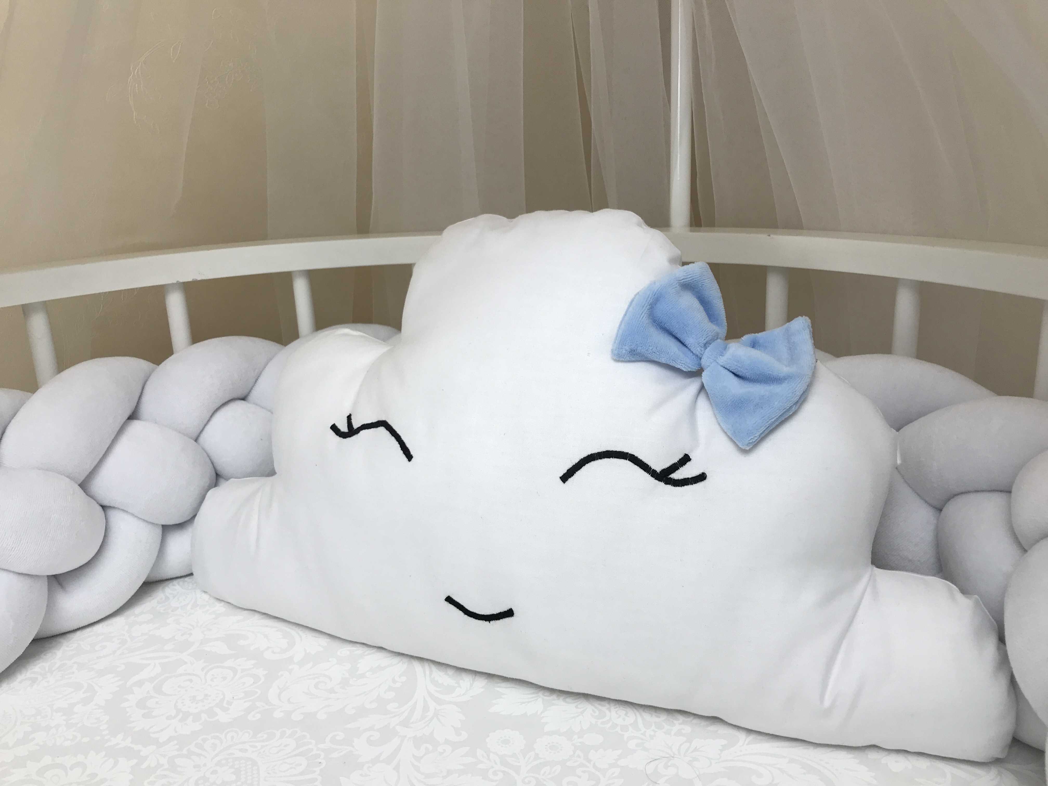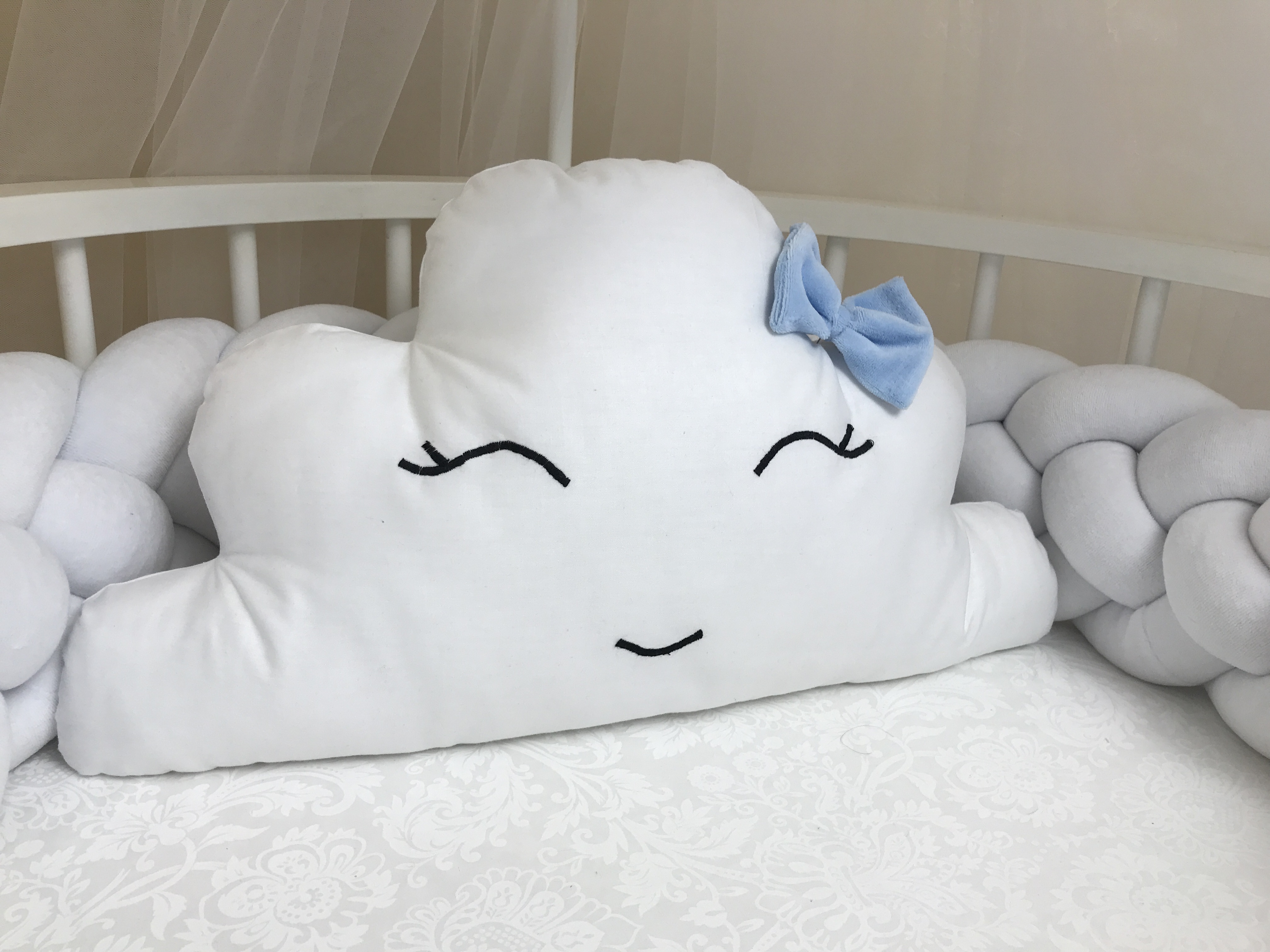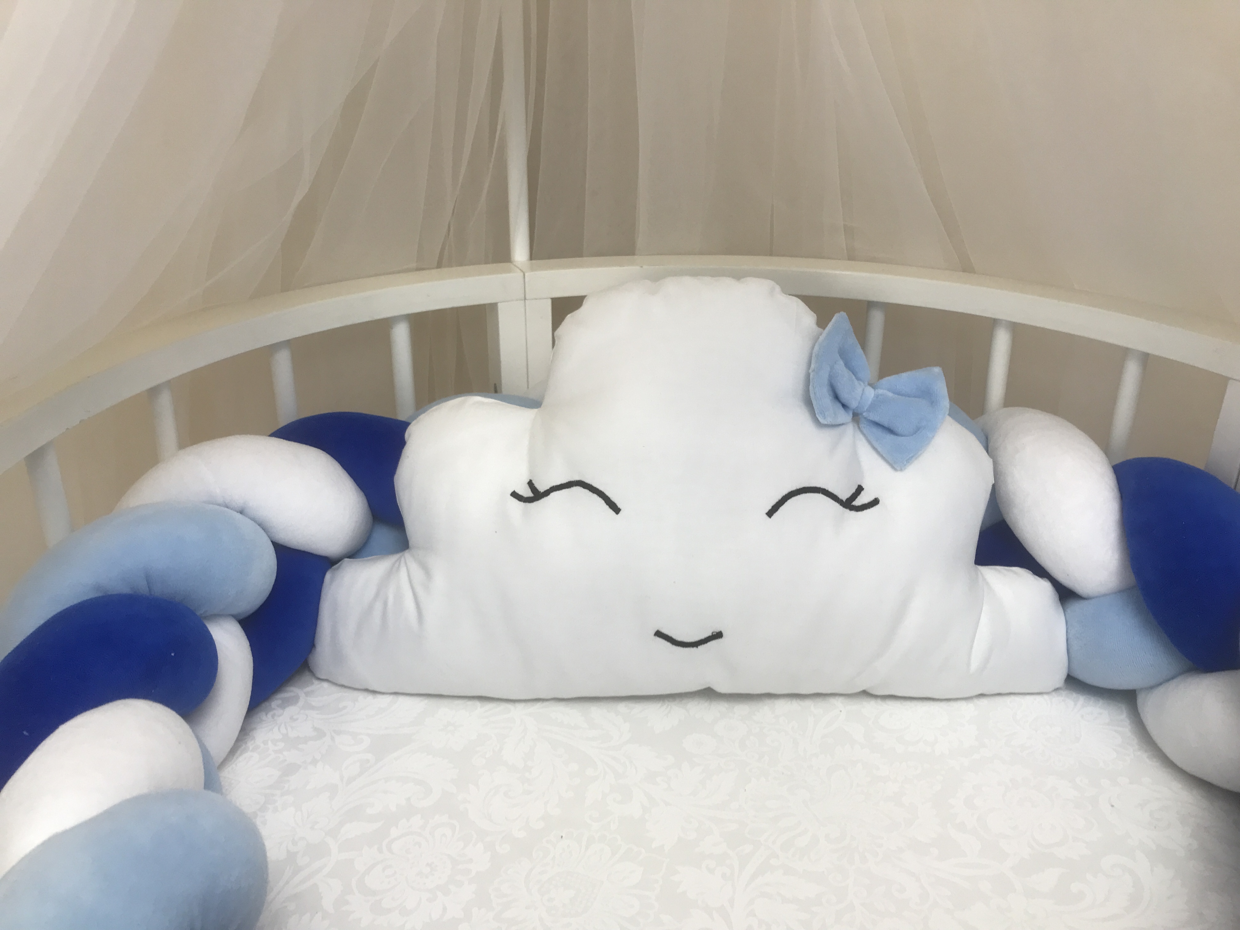 Бортик – подушка в детскую кроватку «Облако». Отлично дополнит бортик – косу в кроватке. Многофункциональна, станет не только украшением, но и заменит в дальнейшем игрушку малышу, на которой можно уснуть во время тихого часа.Подушка облако / Бортик облачк