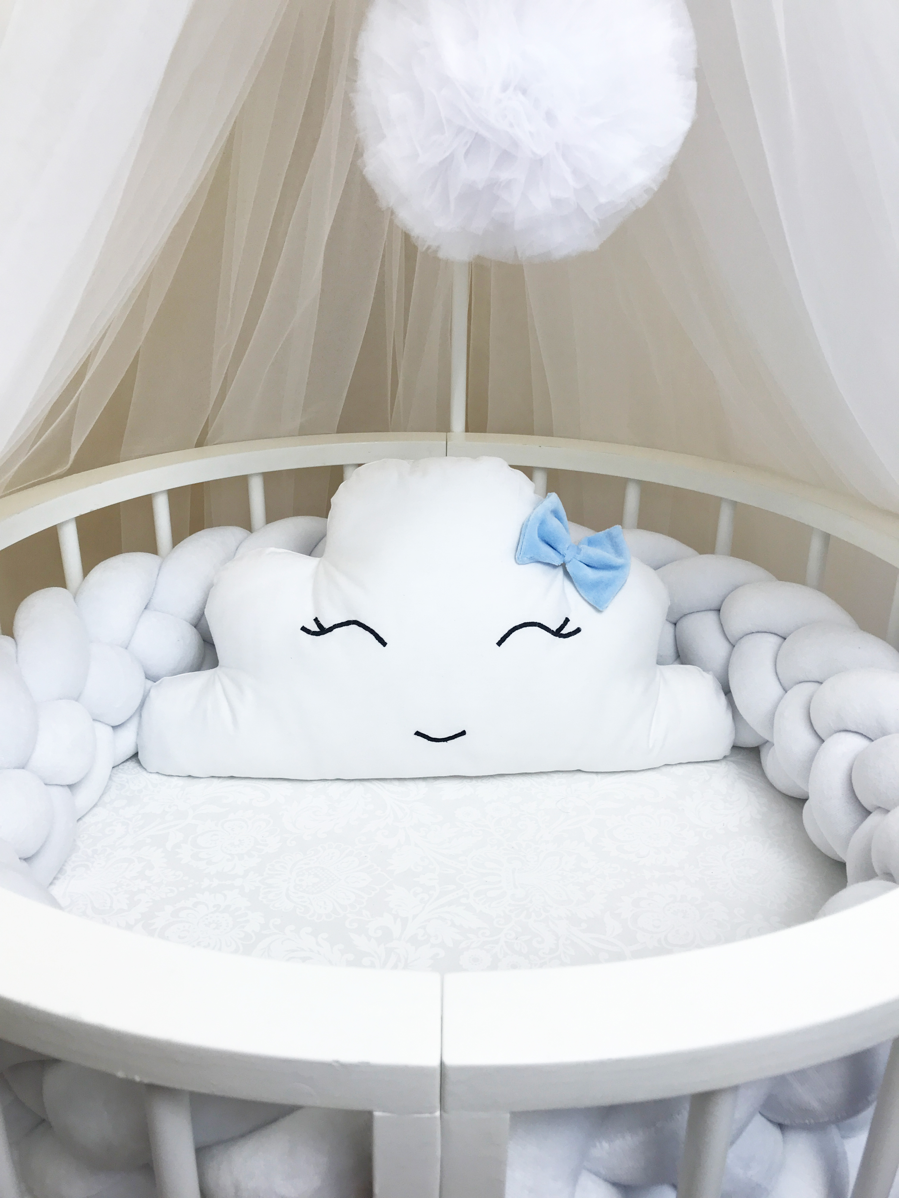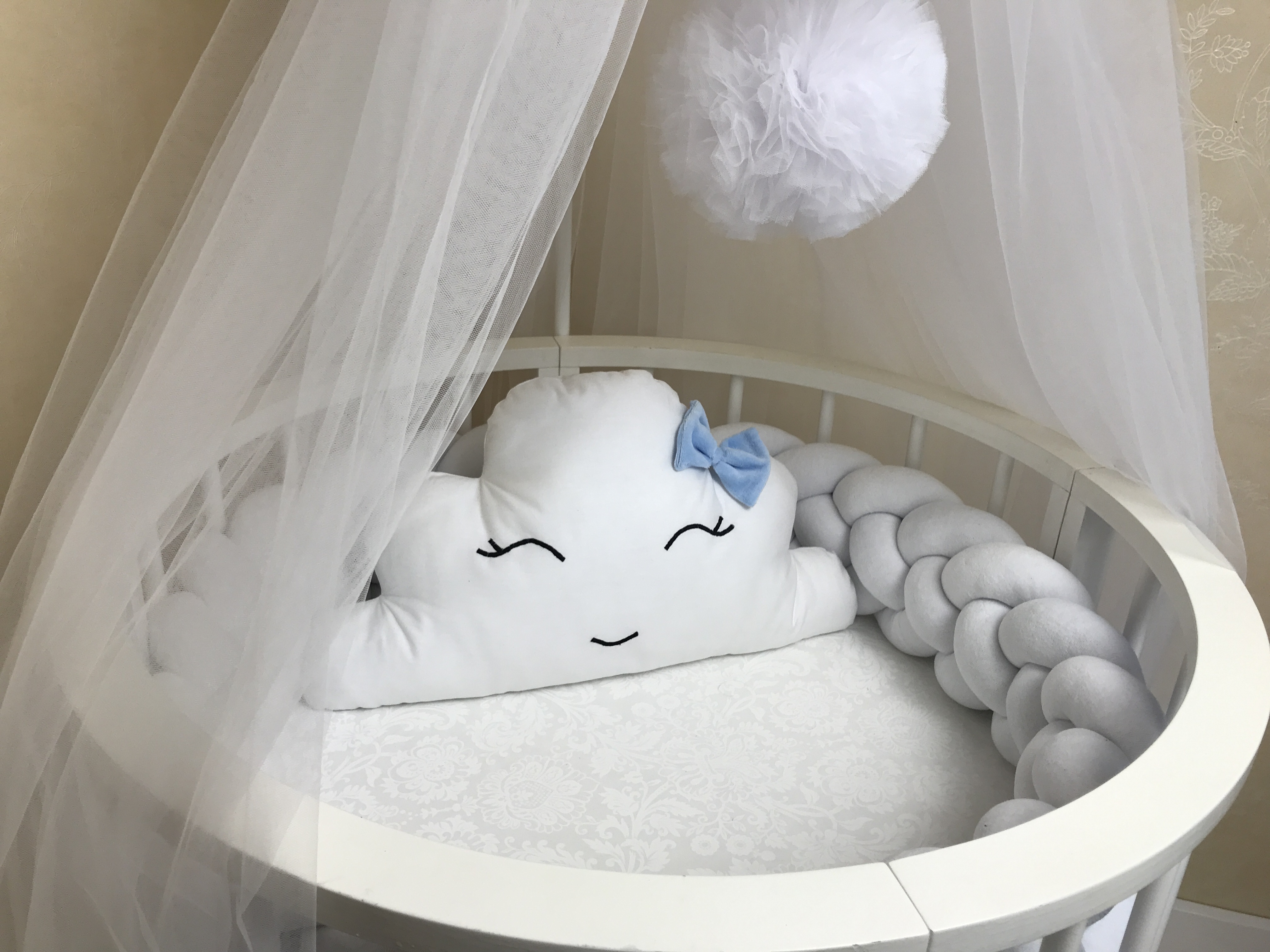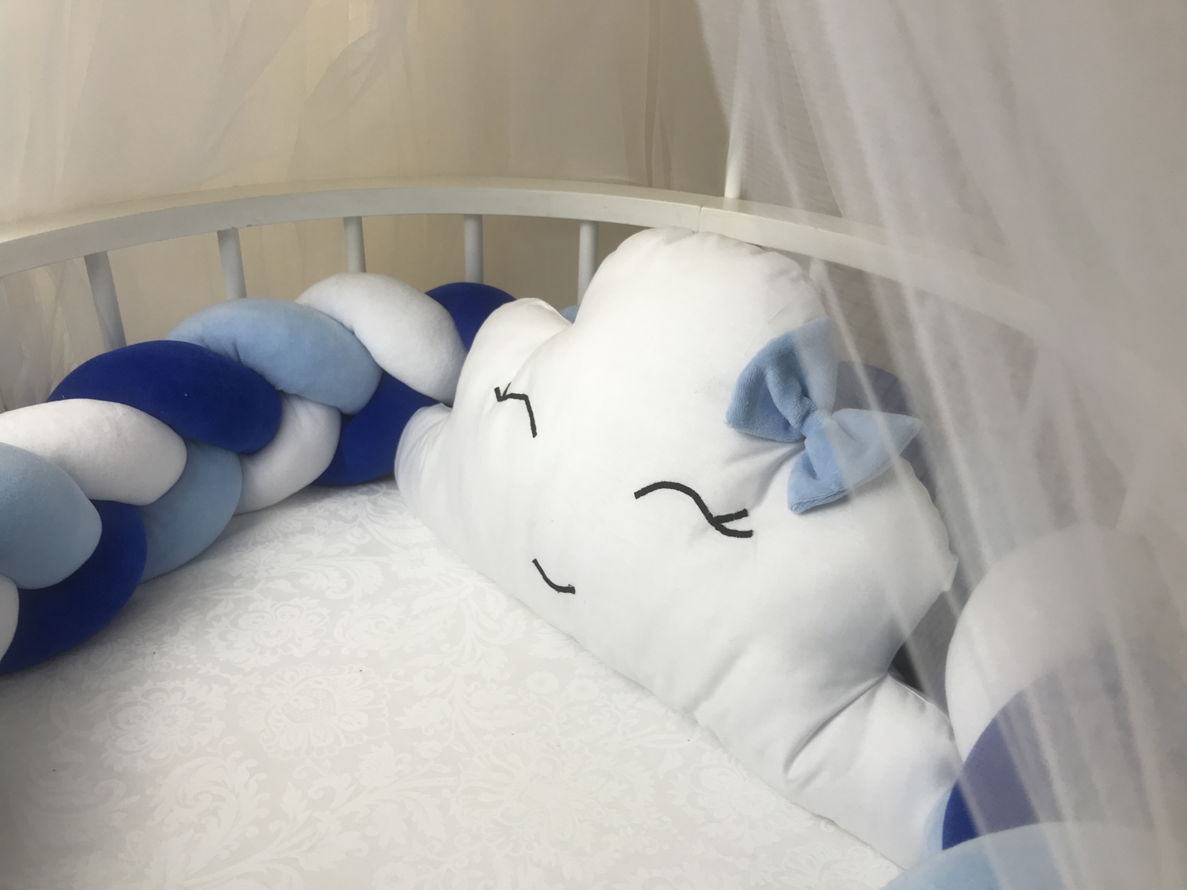 Бортик – подушка в детскую кроватку «Облако». Отлично дополнит бортик – косу в кроватке. Многофункциональна, станет не только украшением, но и заменит в дальнейшем игрушку малышу, на которой можно уснуть во время тихого часа.Подушка облако / Бортик облачк