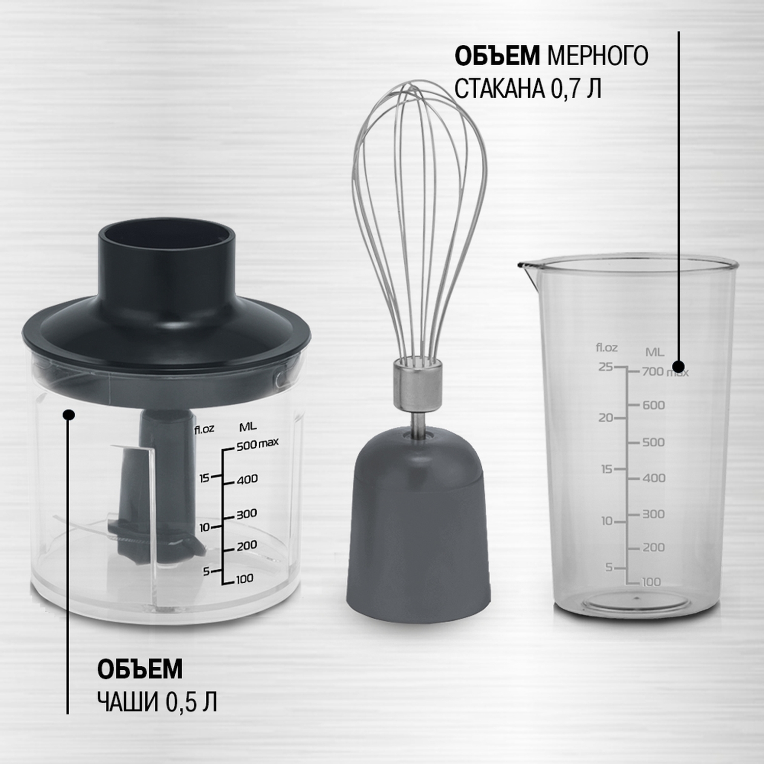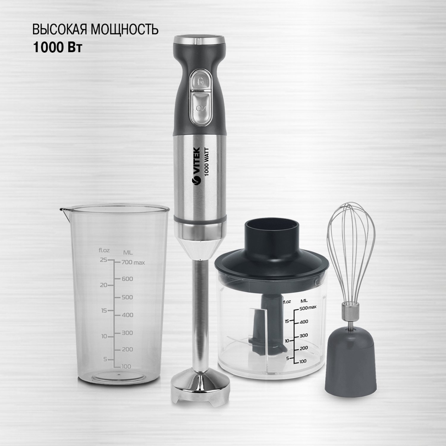 1. Максимальная мощность 1000 Вт 2. Погружная часть и лезвия из нержавеющей стали3. DC мотор с низким уровнем шума4. Плавная регулировка скорости 5. Чаша измельчителя объемом 500 мл6. Стакан для смешивания объемом 700 мл 7. Насадка для взбивания 8. Номина