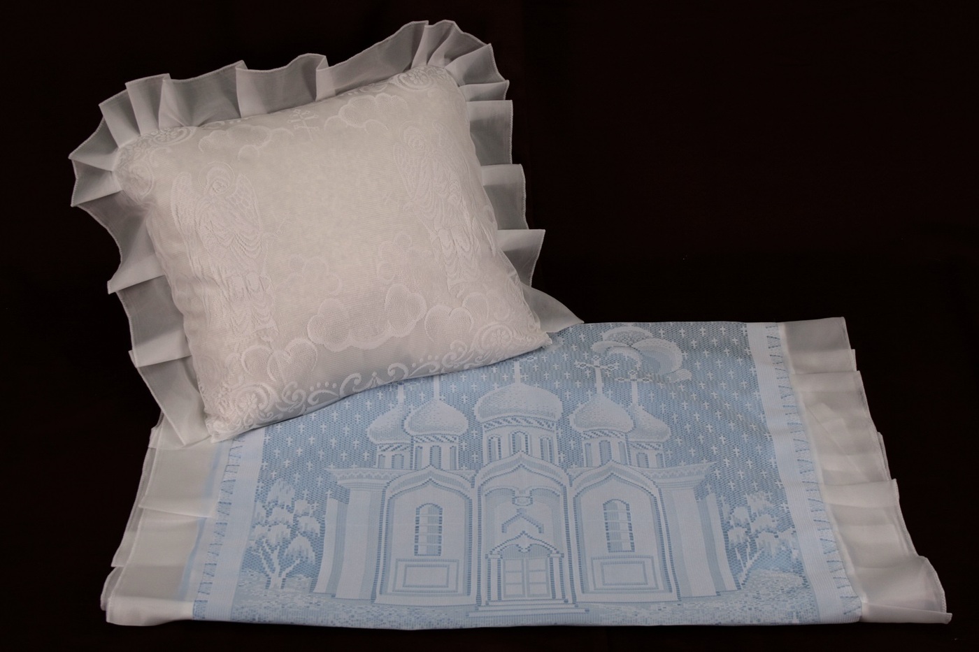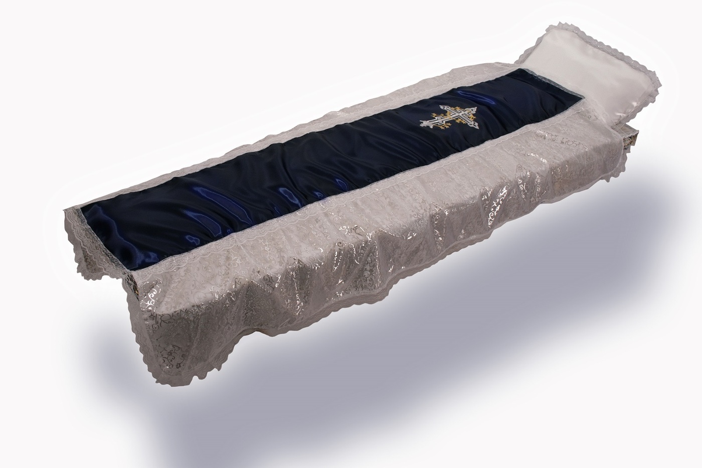 Комплектация:Похоронное покрывало в гроб- 1штука Похоронная наволочка в гроб - 1штукаОписание:Комплект в гроб (покрывало + наволочка) Покрывало из белого атласа с тюлью голубого цвета и рисунками на церковную тематику. Обрамлено белым атласом. Наволочка б