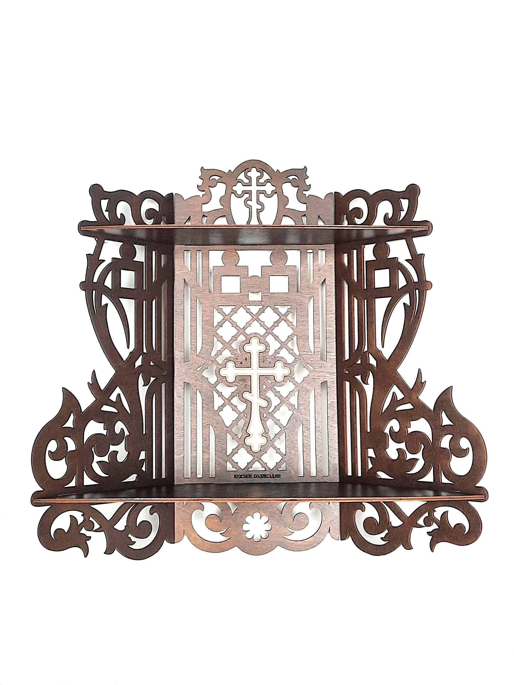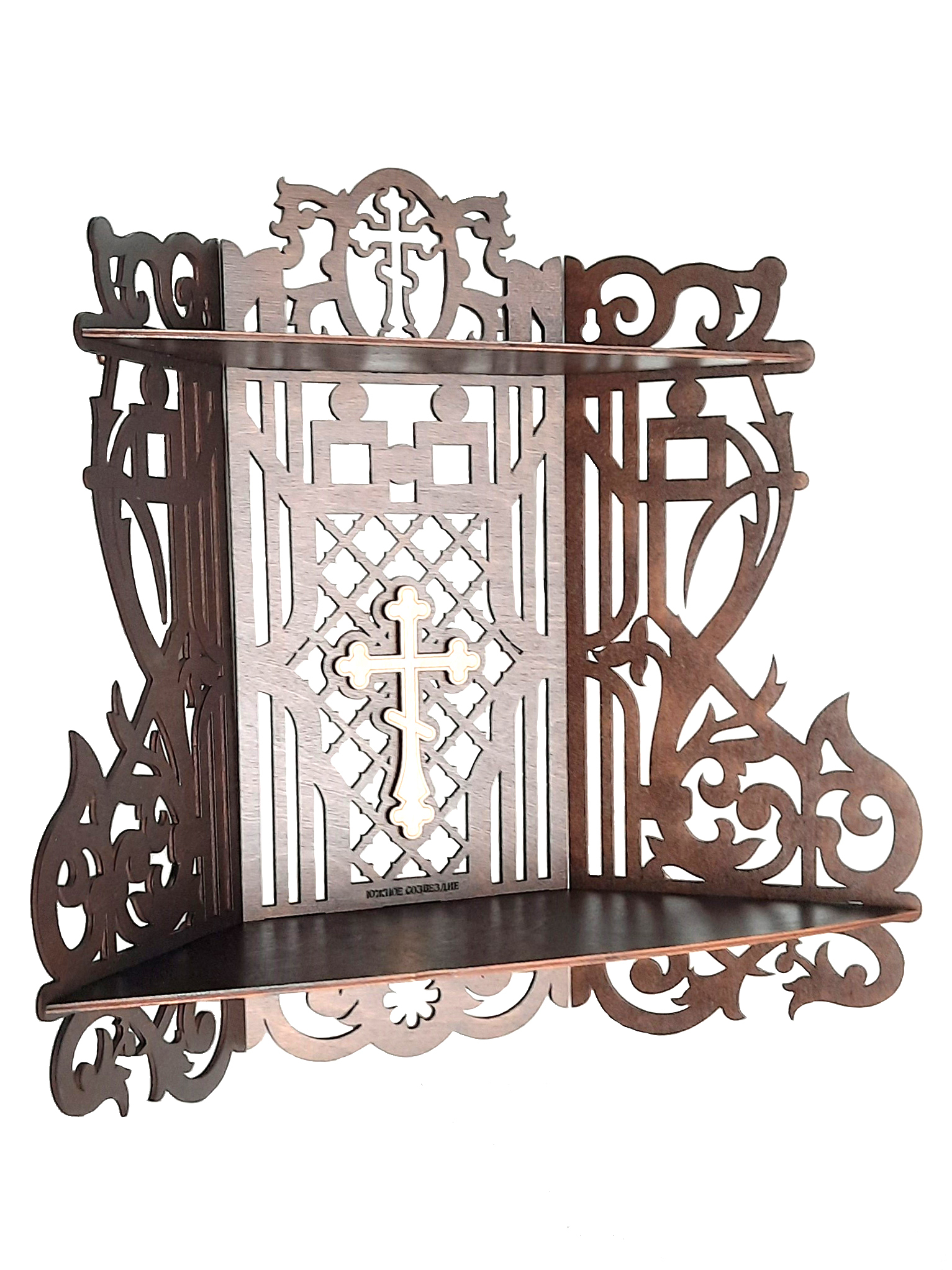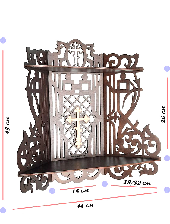 Угловая полка для икон, красивый и удобный способ разместить иконы и образа. Покрыта пропиткой немецкого производства. Покрытие позволяет ухаживать за полкой, проводить влажную уборку, не оставляя тёмных следов от пыли, как на просто отшлифованной фанере.