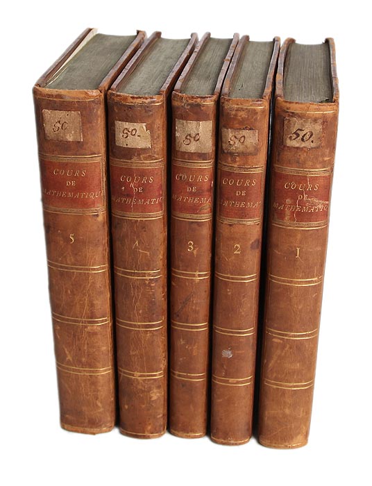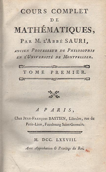 На французском языке. Париж, 1787 год. Издатель Jean-Francois Bastien. Цельнокожаные переплеты с золотым тиснением. Сохранность хорошая. Курс настоятеля Саури напоминает скорее лирическое размышление, а не сухое изложение математической дисциплины.