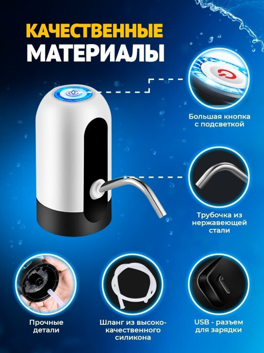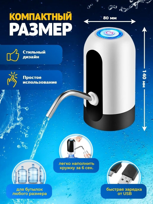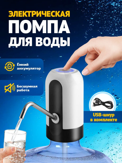 Список совместимых устройств:Бутыли емкостью 5, 10, 13, 17, 19, литровКомплектация:Помпа для воды электрическая.Описание:Магазин Best Market приветствует вас!Хотим представить вашему вниманию помпу для воды электрическую.Помпа электрическая не заменимая ч