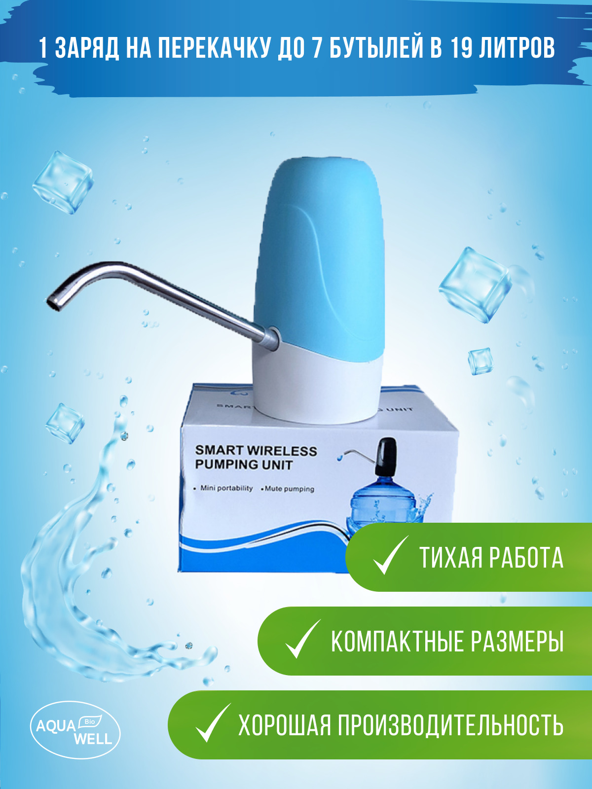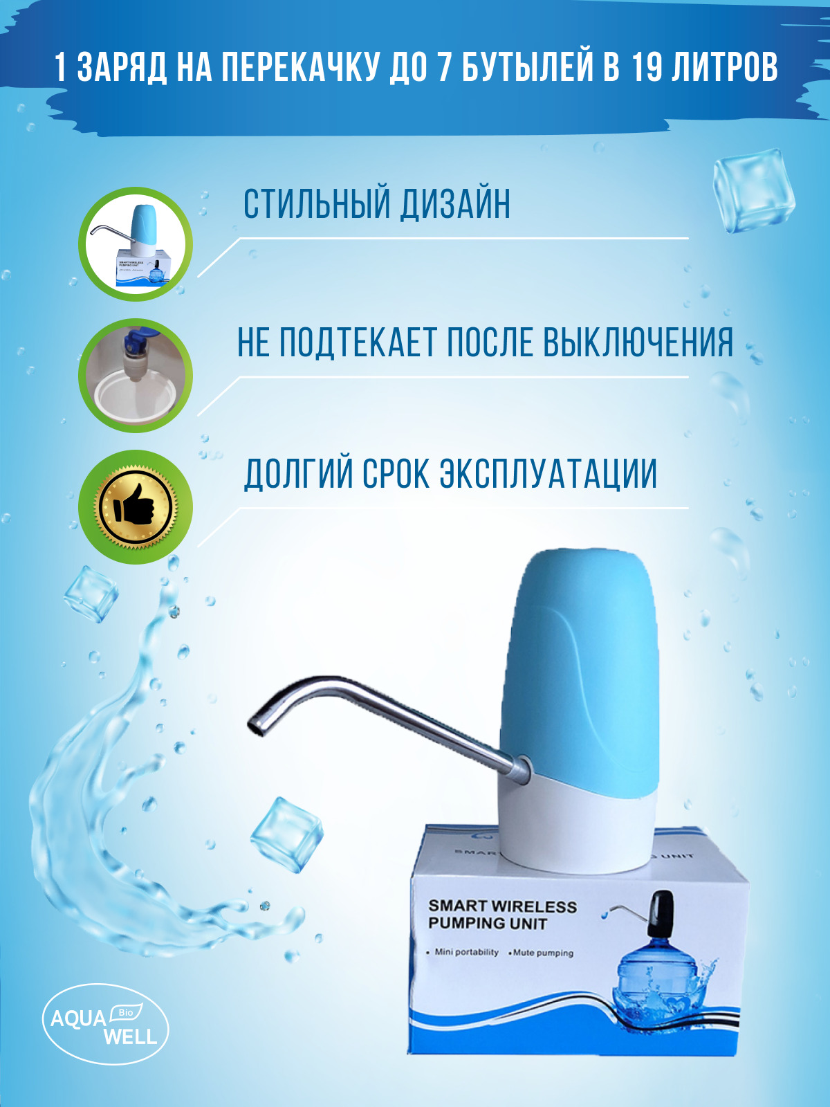 Комплектация:– непосредственно помпа;– носик помпы, для раздачи воды (выполнен из стали 304);– силиконовый патрубок, для забора воды из бутыли;– USB кабель, для подзарядки помпы.Описание:Электрическая помпа для воды K7 с аккумулятором, без переходника.Пом