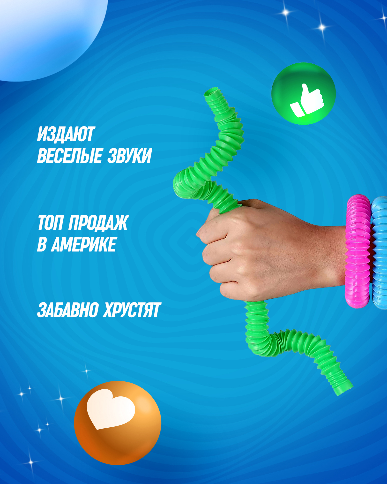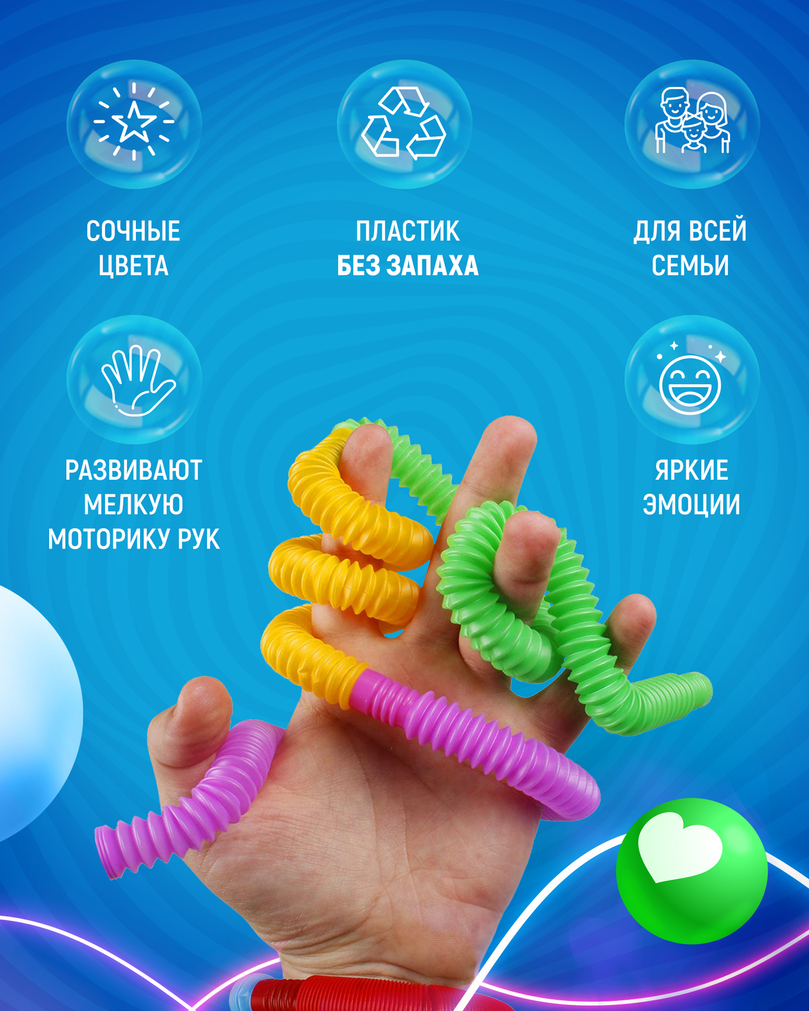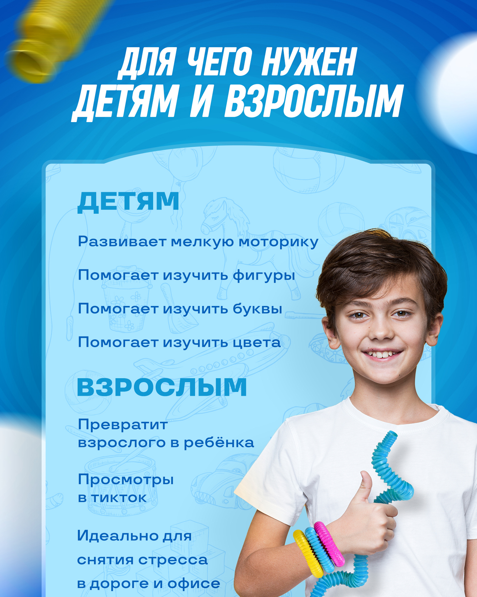 Комплект! Новая трендовая игрушка антистресс для детей и взрослых Pop Tubes! Гибкая трубка гофра тянется, сгибается, щелкает и хлопает! Сохраняет форму изгиба. Трубки соединяются между собой, таким образом можно создавать большие фигуры и разнообразные фо
