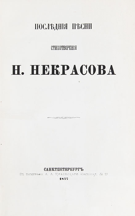 Прижизненное издание. Санкт-Петербург, 1877 год. Типография А. А. Краевского.Типографский переплёт.Сохранность хорошая.Редкая книга.Сборник стихотворений Н. А. Некрасова (1821-1878) ПОСЛЕДНИЕ ПЕСНИ издан поэтом весной 1877 г., за несколько месяцев до конч