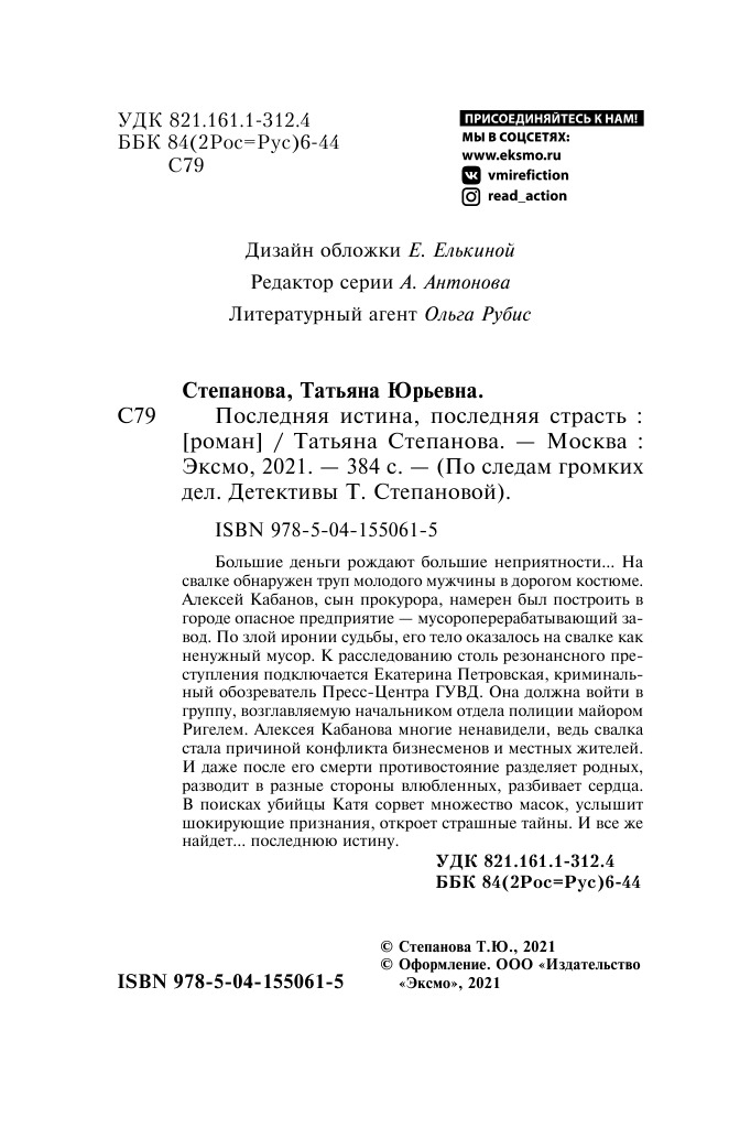 Популярная писательница Татьяна Степанова и издательство «Эксмо» представляют долгожданную остросюжетную новинку «Последняя истина, последняя страсть». Большие деньги рождают большие неприятности… На свалке обнаружен труп молодого мужчины в дорогом костюм